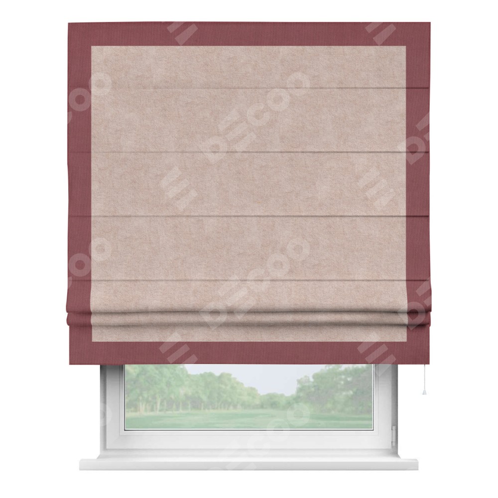 Римская штора производителя «Cortin», используется для проёма, пошита из ткани канвас пудровый, артикул ткани v-35. Отделка шторы кантом «Чесс» (ягодный v-28), ткань для канта используется из канваса разной расцветки на выбор. Имеет универсальный механизм и подходит для монтажа: на потолок, на стену и в нишу.