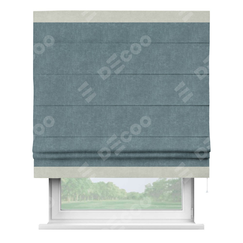 Римская штора производителя «Cortin», используется для проёма, пошита из ткани канвас серо-голубой, артикул ткани v-330. Отделка шторы кантом «Горизонт» (светло-серый v-371), ткань для канта используется из канваса разной расцветки на выбор. Имеет универсальный механизм и подходит для монтажа: на потолок, на стену и в нишу.