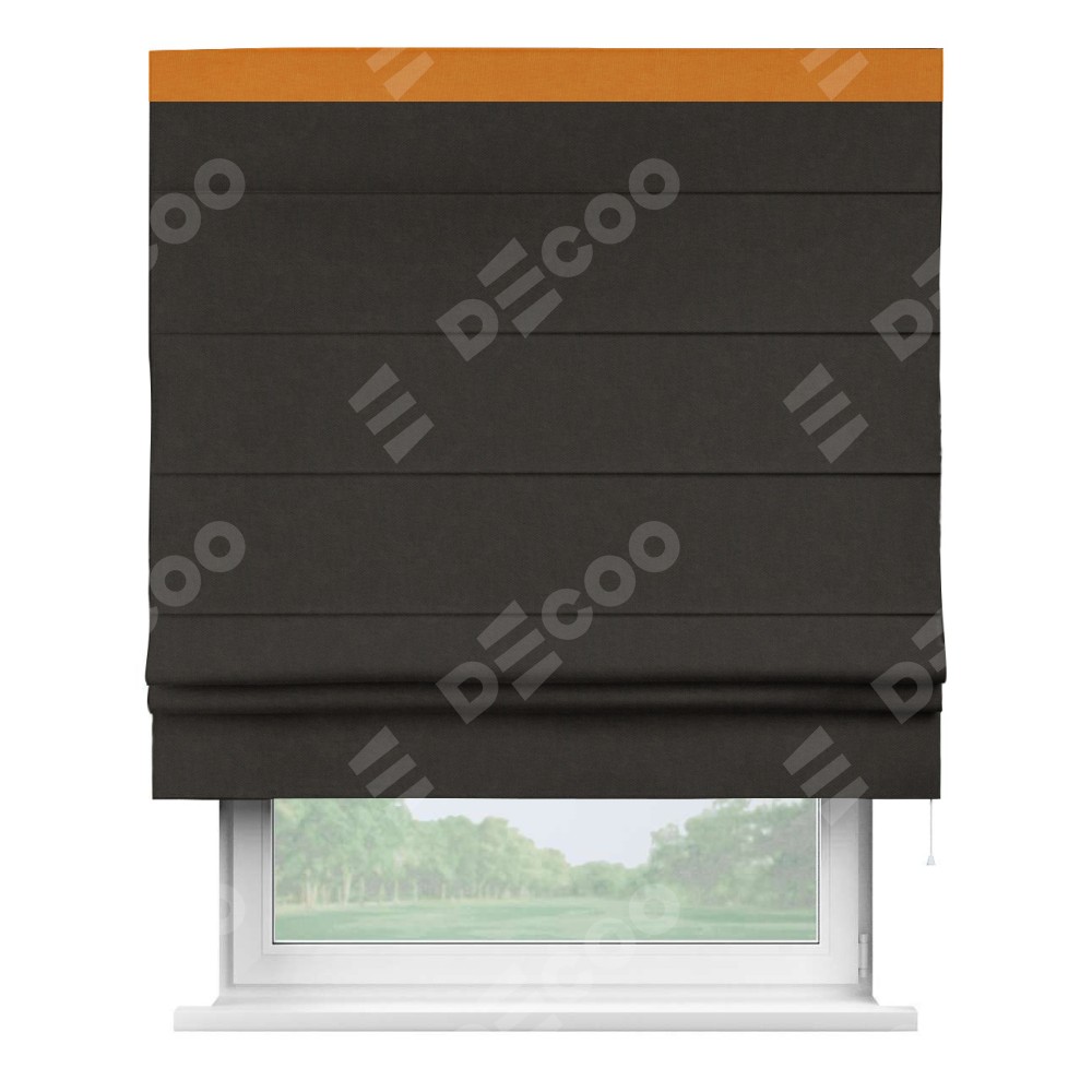 Римская штора производителя «Cortin», используется для проёма, пошита из ткани канвас тёмно-коричневый, артикул ткани v-13. Отделка шторы кантом «Кинг» (оранжевый v-106), ткань для канта используется из канваса разной расцветки на выбор. Имеет универсальный механизм и подходит для монтажа: на потолок, на стену и в нишу.
