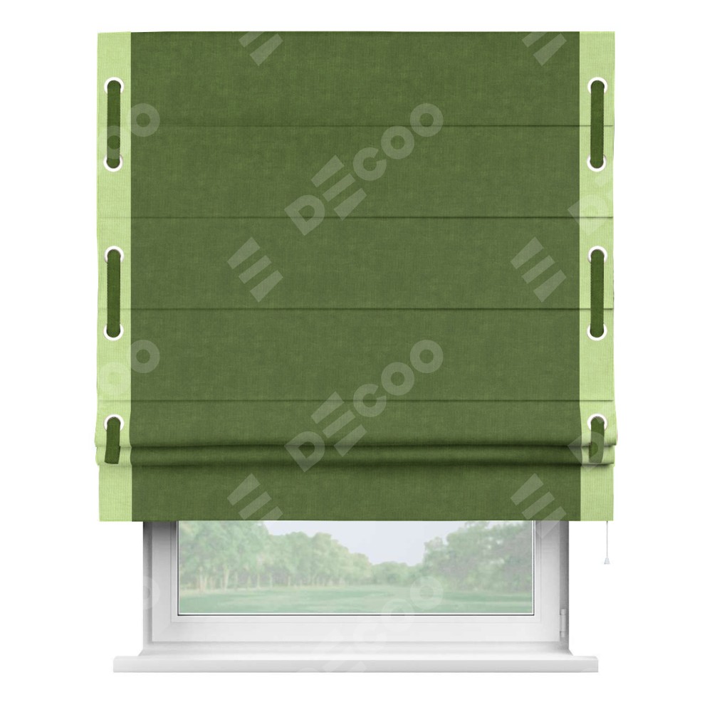 Римская штора производителя «Cortin», используется для проёма, пошита из ткани канвас трава, артикул ткани v-473. Отделка шторы кантом «Стрим Дуо» (липовый v-207) на кантах расположены люверсы с пояском, ткань для канта используется из канваса разной расцветки на выбор. Ткань для пояска обычно используется из основной ткани шторы, а так же можно сделать из любой расцветки по желанию. Имеет универсальный механизм и подходит для монтажа: на потолок, на стену и в нишу.