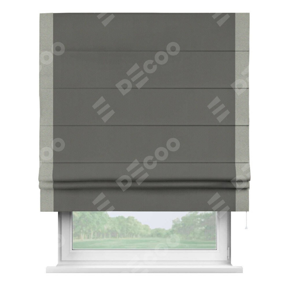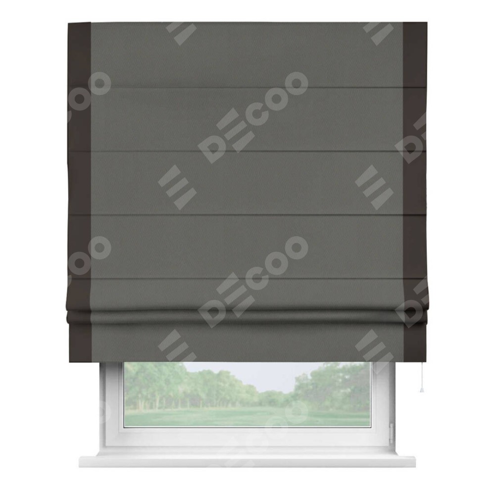 Римская штора производителя «Cortin», используется для проёма, пошита из ткани блэкаут однотонный тёмно-серый, артикул ткани 91570. Отделка шторы кантом «Стрим Дуо», ткань для канта используется из блэкаута однотонного разной расцветки на выбор. Имеет универсальный механизм и подходит для монтажа: на потолок, на стену и в нишу.