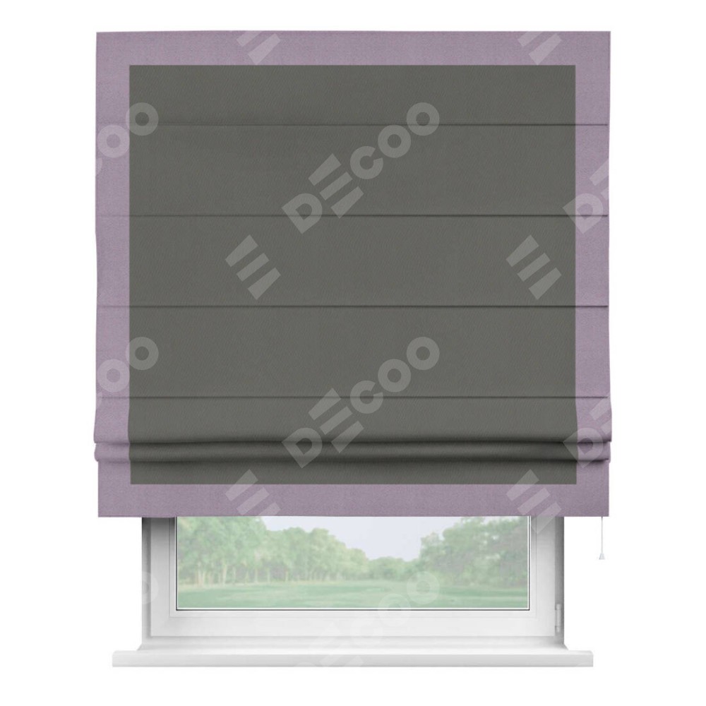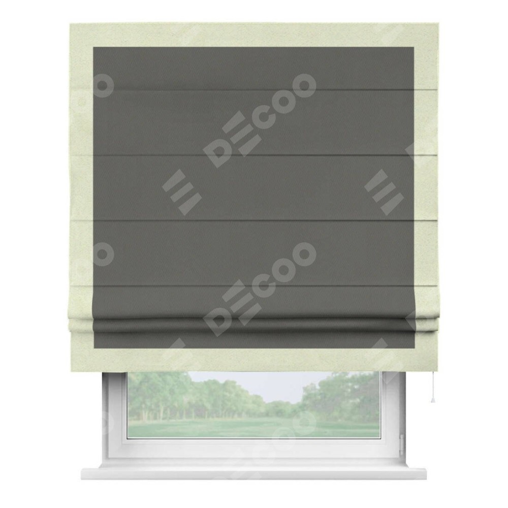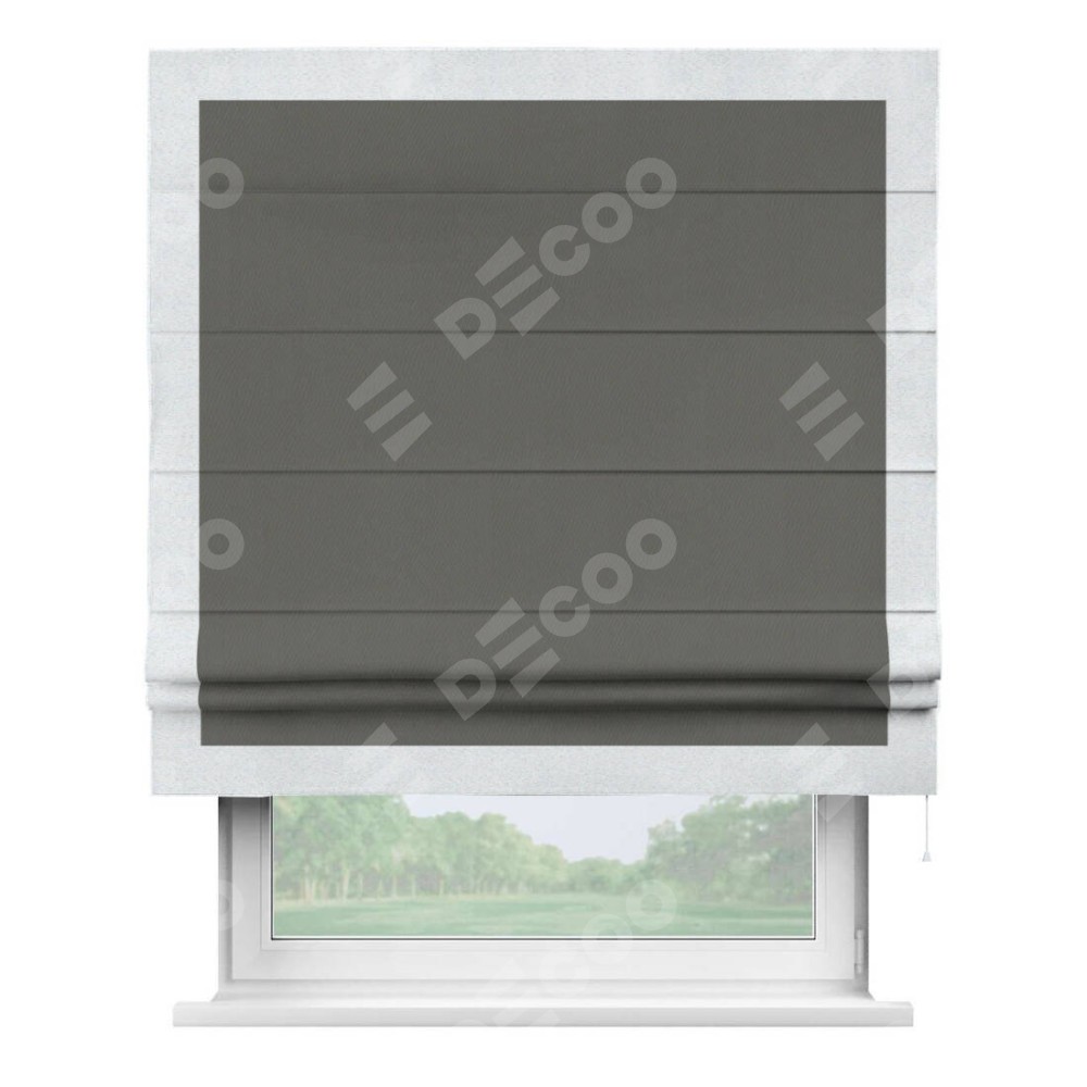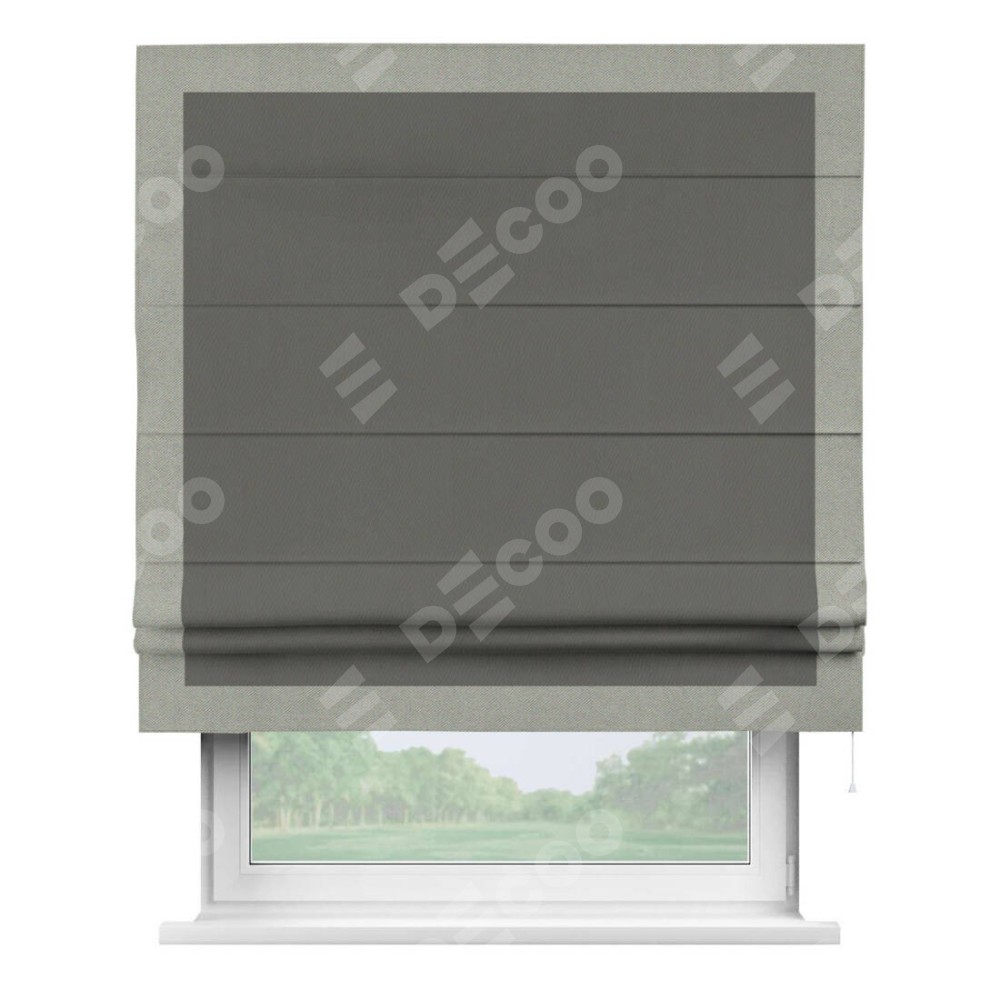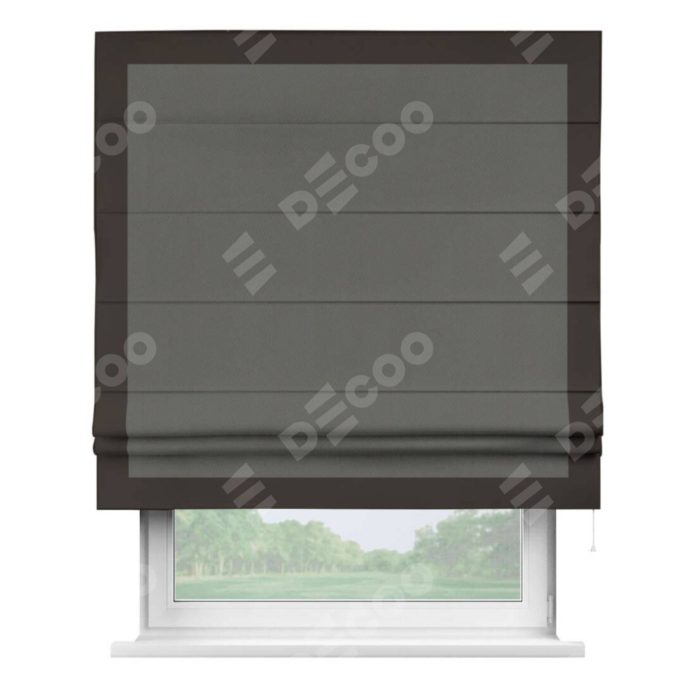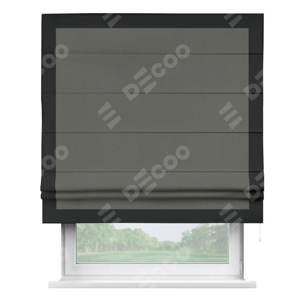 Римская штора производителя «Cortin», используется для проёма, пошита из ткани блэкаут однотонный тёмно-серый, артикул ткани 91570. Отделка шторы кантом «Чесс», ткань для канта используется из блэкаута однотонного разной расцветки на выбор. Имеет универсальный механизм и подходит для монтажа: на потолок, на стену и в нишу.