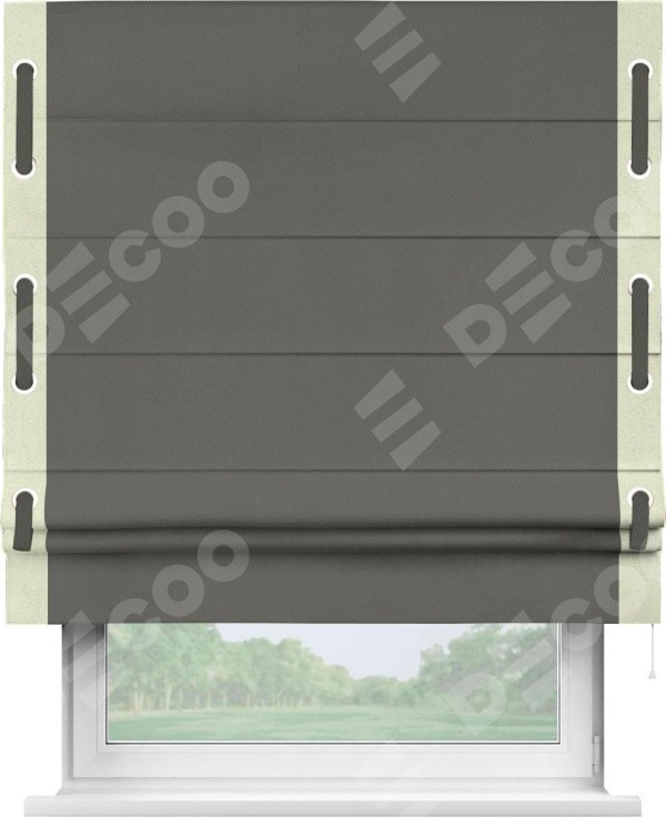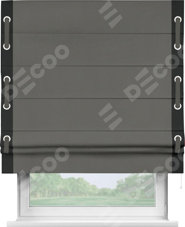 Римская штора производителя «Cortin», используется для проёма, пошита из ткани блэкаут однотонный тёмно-серый, артикул ткани 91570. Отделка шторы кантом «Стрим Дуо» на кантах расположены люверсы с пояском, ткань для канта используется из блэкаута однотонного разной расцветки на выбор. Ткань для пояска обычно используется из основной ткани шторы, а так же можно сделать из любой расцветки по желанию. Имеет универсальный механизм и подходит для монтажа: на потолок, на стену и в нишу.