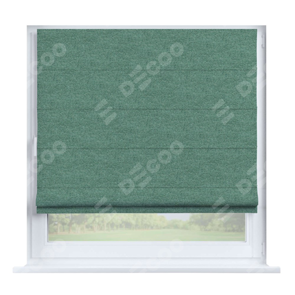 Римская штора производителя «Cortin», устанавливается на створку окна, пошита из ткани твид блэкаут бирюзовый, артикул 90934. Штора шьётся по индивидуальным размерам, для данного типа римской шторы возможная ширина от 35 до 150 см., высота до 250 см.