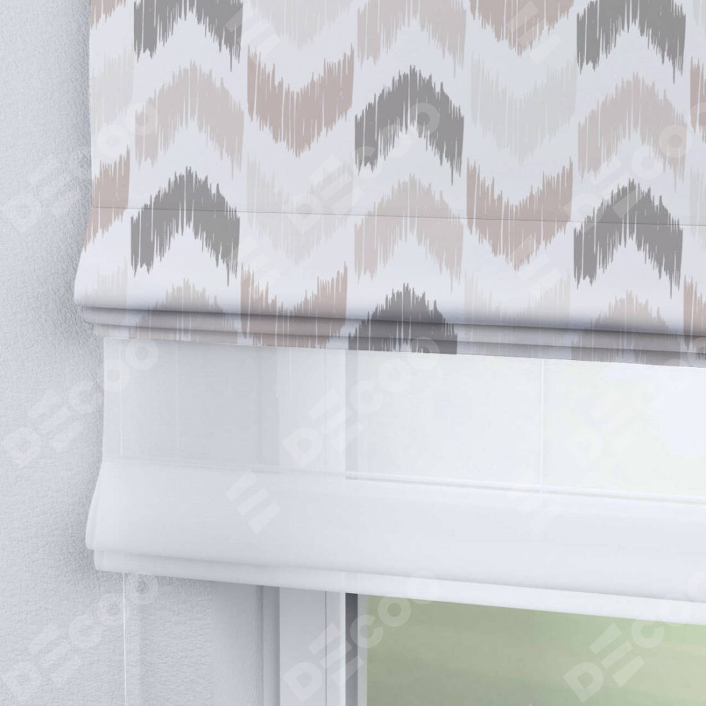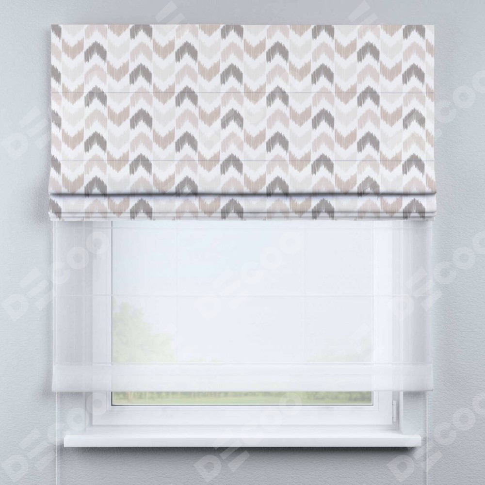Двойная римская штора «День-ночь» от производителя Cortin предназначена для использования в проёмах. Эта штора уникальна тем, что состоит из двух полотен. На лицевой стороне находится блэкаут с нанесением сублимационной печати «Икат стрелки», обеспечивающий эффективное затемнение. В комплект также входит вторая ткань — легкий белый тюль (артикул: V-01), который добавляет изящества и легкости оформлению окна. Кроме того, доступны и другие разновидности ткани тюль, выбор которых доступен по ссылке .