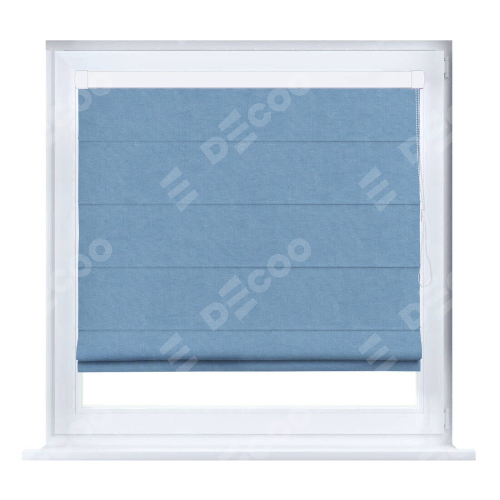 Римская штора производителя «Cortin», устанавливается на створку окна, пошита из ткани канвас голубой, артикул 92729. Штора шьётся по индивидуальным размерам, для данного типа римской шторы возможная ширина от 35 до 150 см., высота до 250 см.