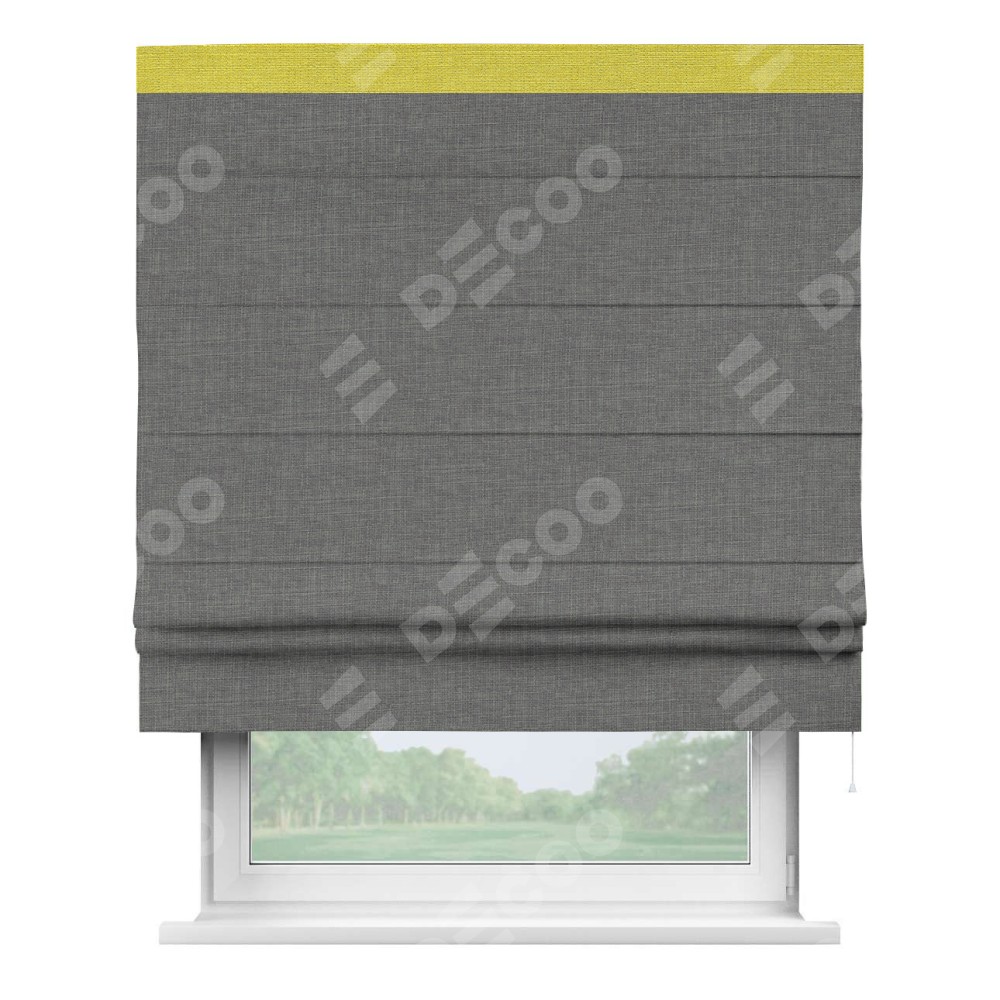 Римская штора производителя «Cortin», используется для проёма, пошита из ткани лён тёмно-серый, артикул 7441. Отделка шторы кантом «Кинг», ткань для канта используется из льна разной расцветки на выбор. Имеет универсальный механизм и подходит для монтажа: на потолок, на стену и в нишу.