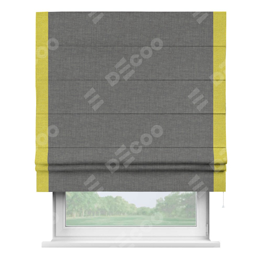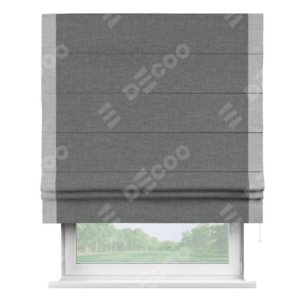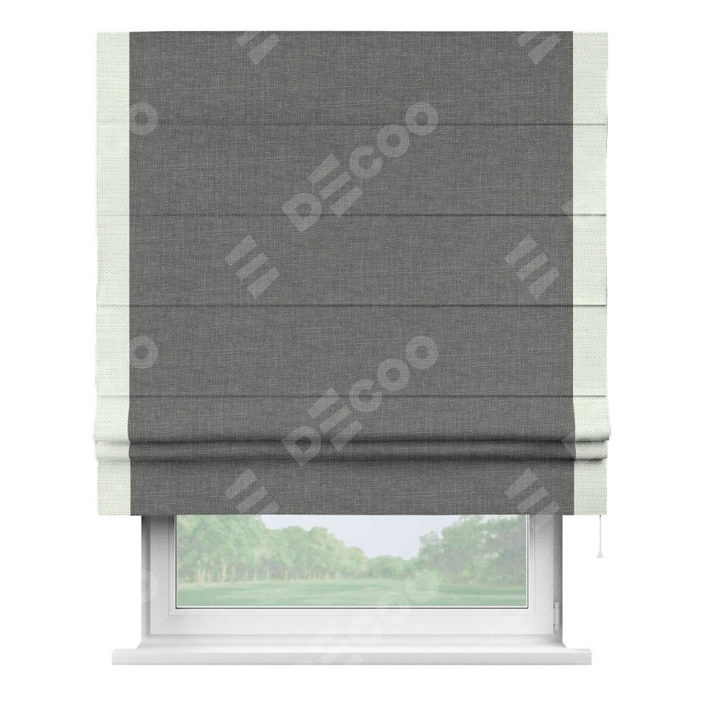 Римская штора производителя «Cortin», используется для проёма, пошита из ткани лён тёмно-серый, артикул 7441. Отделка шторы кантом «Стрим Дуо», ткань для канта используется из льна разной расцветки на выбор. Имеет универсальный механизм и подходит для монтажа: на потолок, на стену и в нишу.