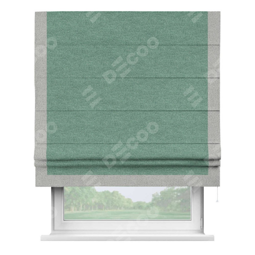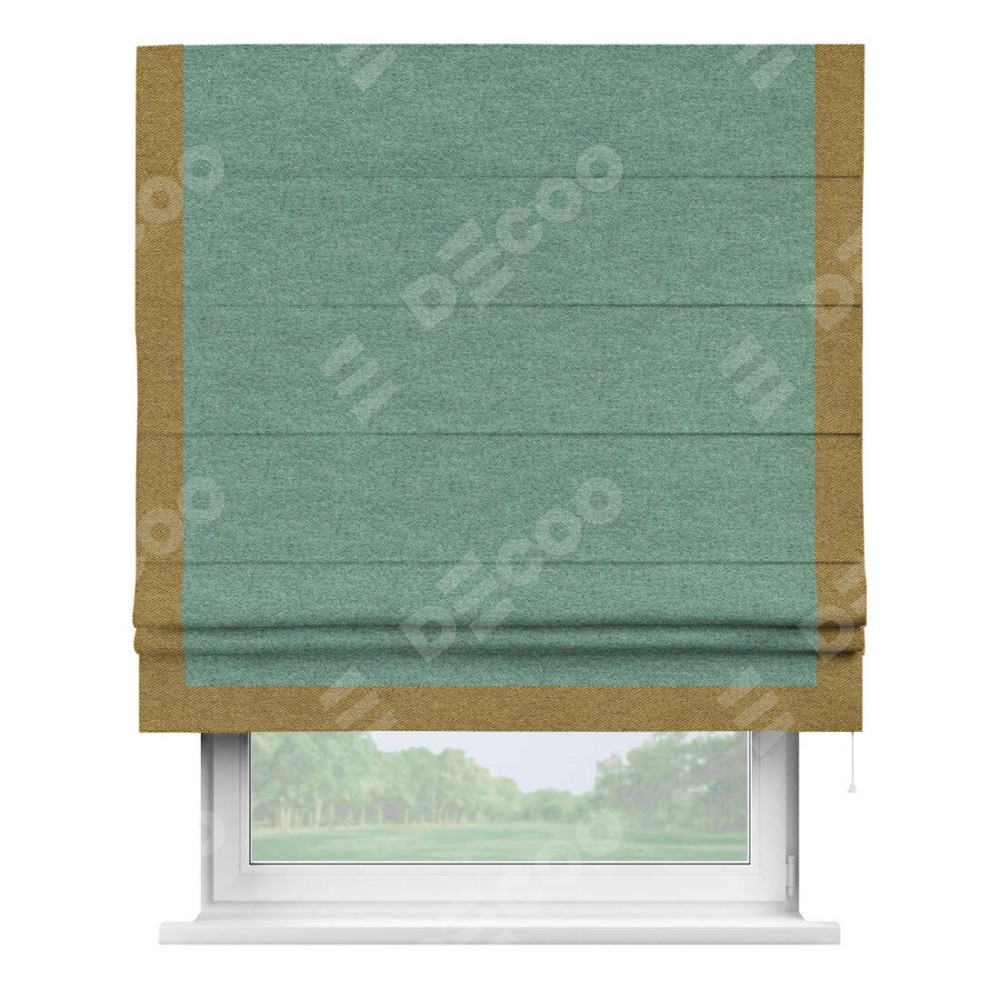Римская штора производителя «Cortin», используется для проёма, пошита из ткани твид блэкаут бирюзовый, артикул 90934. Отделка шторы кантом «Виктория», ткань для канта используется из твида разной расцветки на выбор. Имеет универсальный механизм и подходит для монтажа: на потолок, на стену и в нишу.