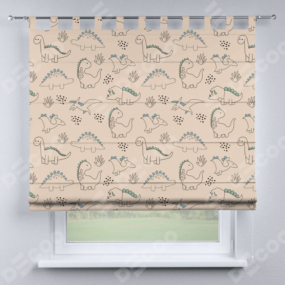 Римская штора производителя «Cortin», используется для проёма, пошита из ткани блэкаут с нанесением сублимационной печати «Динозаврики». Данная модель пошита на петлях, комплектуется на выбор круглым карнизом и подходит для монтажа на стену. Римская штора на петлях имеет простую систему регулировки высоты, отличительным преимуществом данной модели является простой способ монтажа. Достаточно повесить ее на трубу и штора готова!
