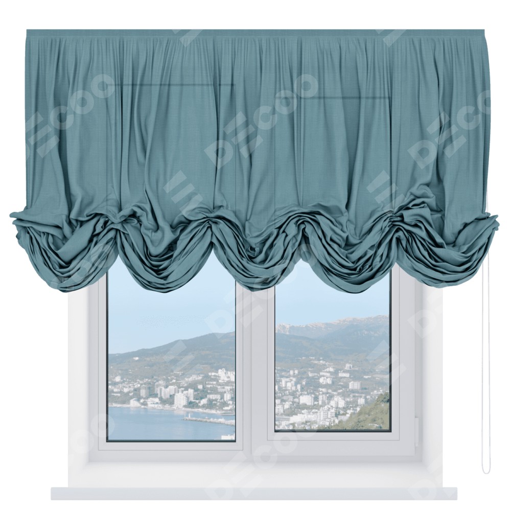 Австрийская штора производителя «Cortin», используется для проёма, пошита из ткани лён голубой, артикул ткани 74736. Имеет универсальный механизм и подходит для монтажа: на потолок и на стену.
