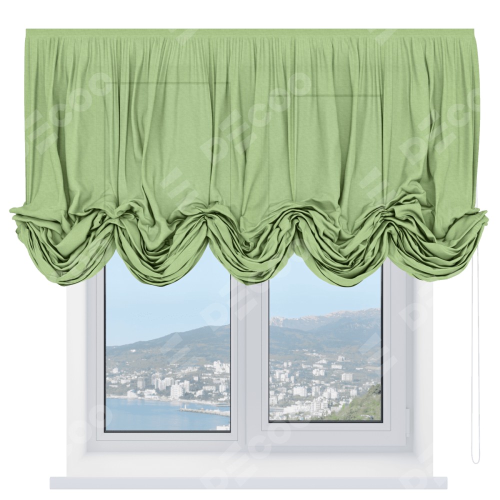 Австрийская штора производителя «Cortin», используется для проёма, пошита из ткани лён зелёный, артикул ткани 85906. Имеет универсальный механизм и подходит для монтажа: на потолок и на стену.