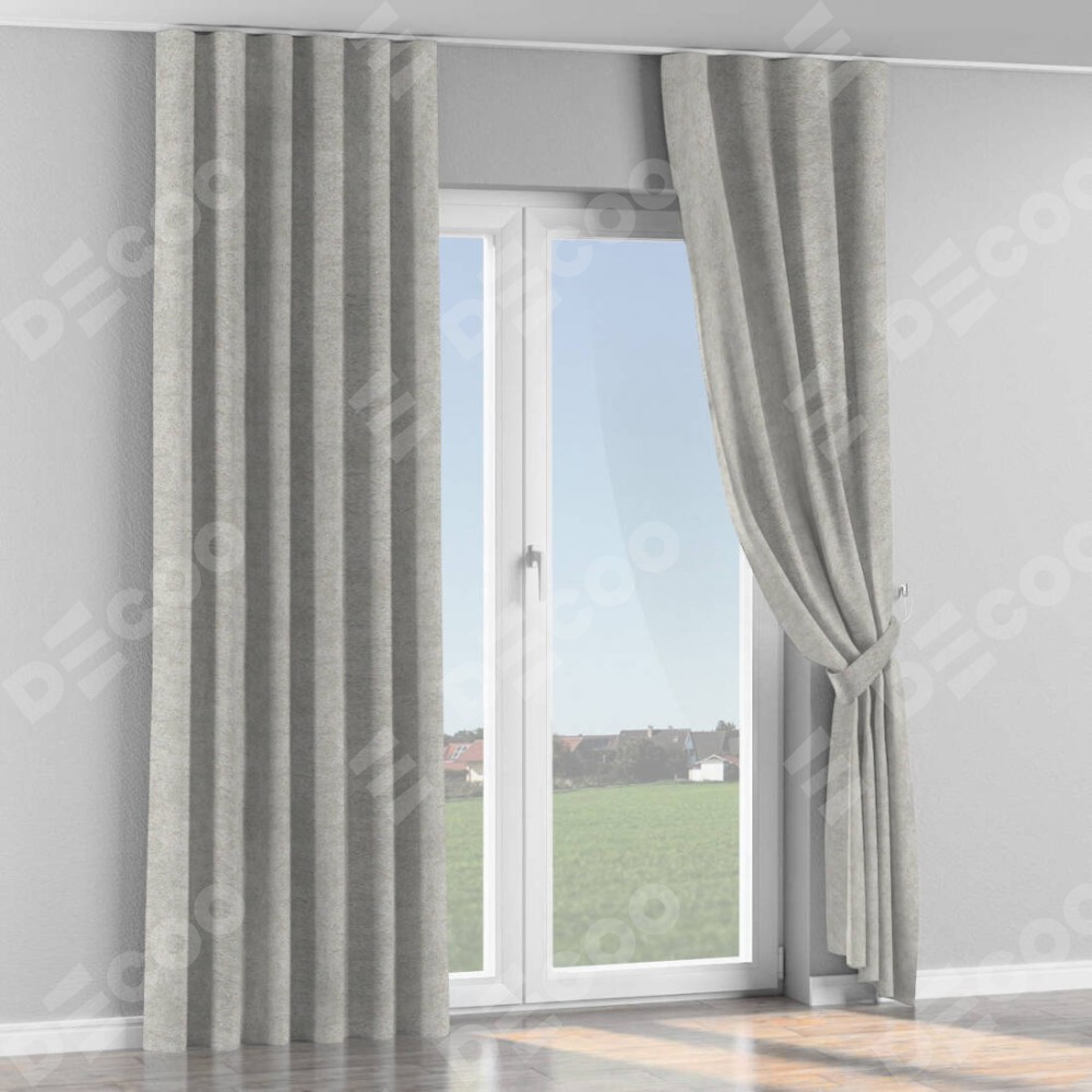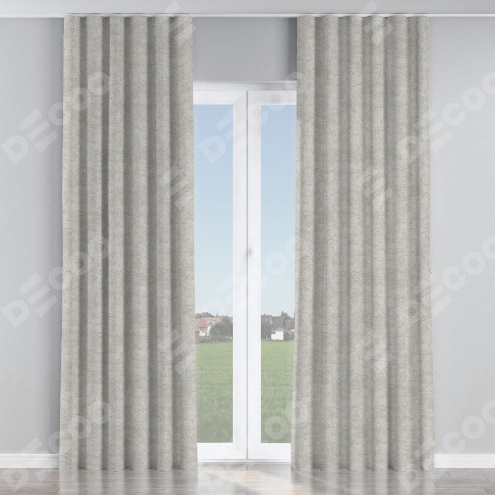 Комплект прямых штор, от производителя «Cortin», пошиты из ткани софт мрамор светло-серый, артикул ткани 93582. С изнаночной стороны в верхней части штор пристрачивается шторная лента с декоративными складками «Волна». Для создания элегантных складок прямые шторы шьются по стандарту с коэффициентом 1:2 (на 100 см. ширины проёма 200 см. ширины ткани).