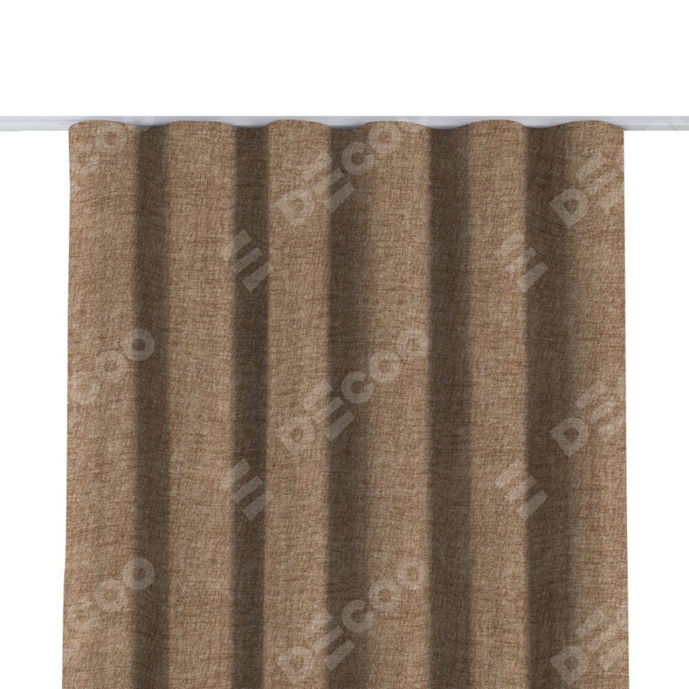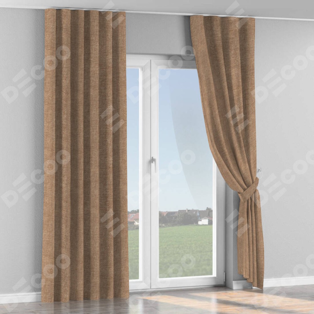 Комплект прямых штор, от производителя «Cortin», пошиты из ткани рогожка димаут светло-коричневый, артикул ткани 91017. С изнаночной стороны в верхней части штор пристрачивается шторная лента с декоративными складками «Волна». Для создания элегантных складок прямые шторы шьются по стандарту с коэффициентом 1:2 (на 100 см. ширины проёма 200 см. ширины ткани).
