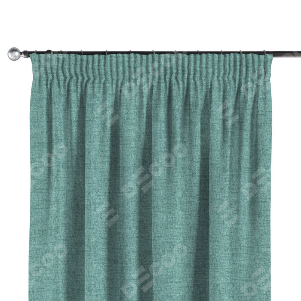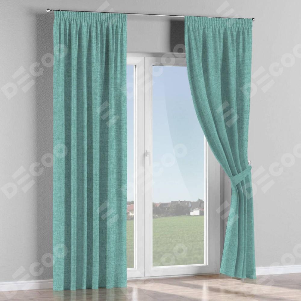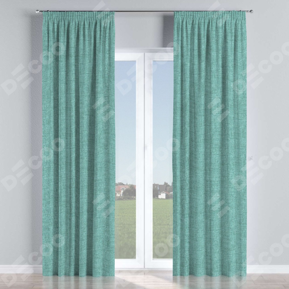 Комплект прямых штор, от производителя «Cortin», пошиты из ткани рогожка димаут аквамариновый крайола, артикул ткани 91023. С изнаночной стороны в верхней части штор пристрачивается шторная лента с декоративными складками «Карандаш». Для создания элегантных складок прямые шторы шьются по стандарту с коэффициентом 1:2 (на 100 см. ширины проёма 200 см. ширины ткани).