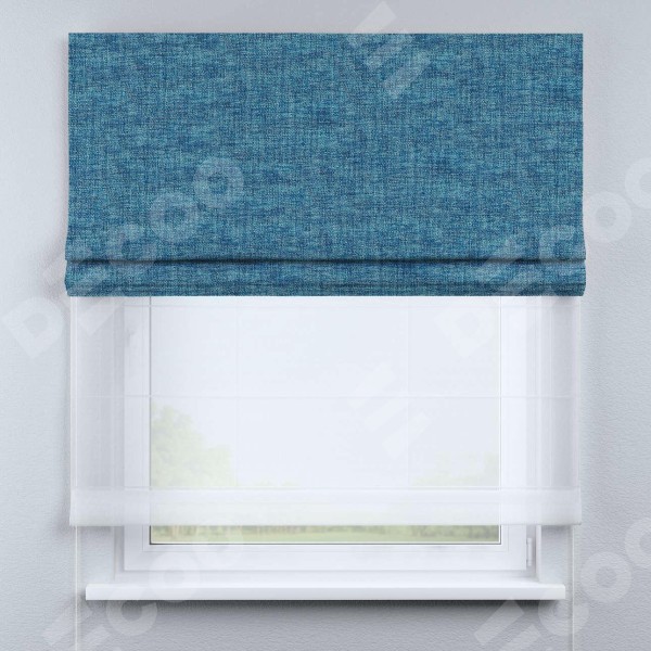 Двойная римская штора «День-ночь» от производителя Cortin предназначена для использования в проёмах. Эта штора уникальна тем, что состоит из двух полотен. На лицевой стороне находится рогожка димаут лазурно-синий (артикул: 91024), обеспечивающий эффективное затемнение. В комплект также входит вторая ткань — легкий белый тюль (артикул: V-01), который добавляет изящества и легкости оформлению окна. Кроме того, доступны и другие разновидности ткани тюль, выбор которых доступен по  ссылке .