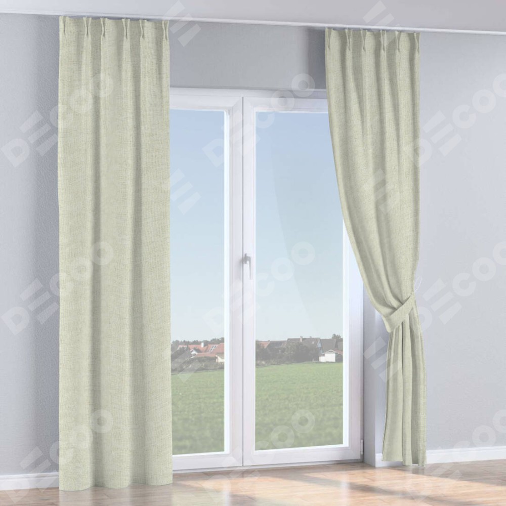 Комплект прямых штор, от производителя «Cortin», пошиты из ткани рогожка димаут серо-бежевый, артикул ткани 91014. С изнаночной стороны в верхней части штор пристрачивается шторная лента с декоративными складками «Кустик». Для создания элегантных складок прямые шторы шьются по стандарту с коэффициентом 1:2 (на 100 см. ширины проёма 200 см. ширины ткани).
