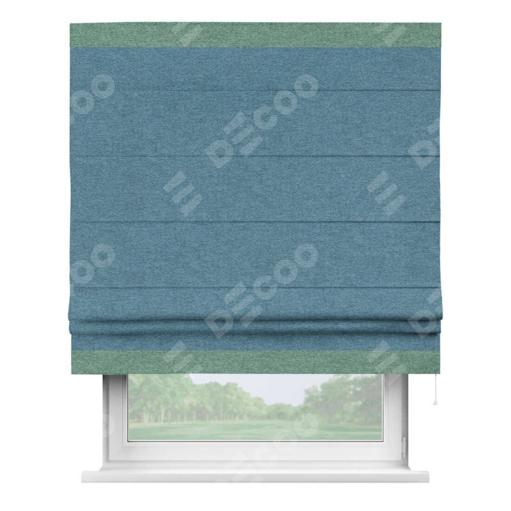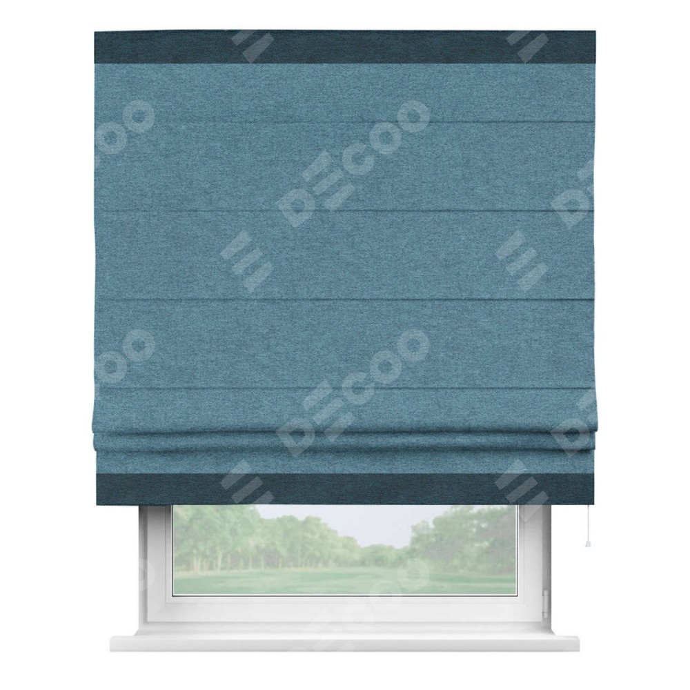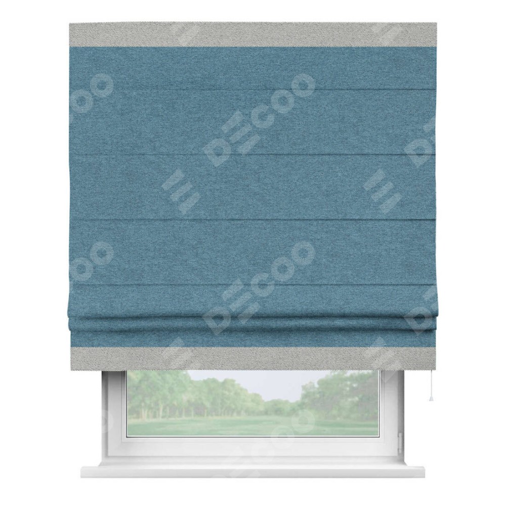Римская штора пошита из ткани твид блэкаут светло-синий, артикул: 90935, с отделкой кантом «Горизонт» предлагает уникальное дизайнерское решение, при котором кант располагается только вверху и снизу шторы. Такое решение делает акцент на горизонтальных линиях, визуально расширяя пространство и придавая окну более строгий и организованный вид. Отделка кантом в этих ключевых местах не только украшает штору, но и способствует её долговечности, защищая наиболее уязвимые к износу края.