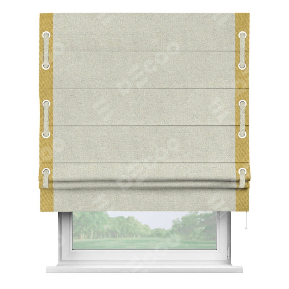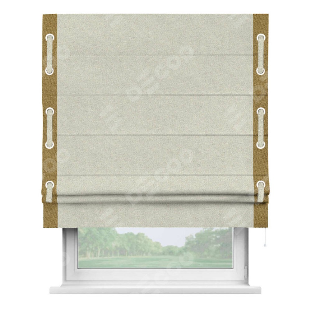Римская штора пошита из ткани твид блэкаут шампань, артикул: 90929, с отделкой кантом «Стрим Дуо», дополненная декоративными люверсами на этих кантах и протянутым пояском из основного цвета римской шторы, представляет собой высоко декоративное и функциональное решение для оконного оформления. Канты, расположенные по обеим боковым сторонам шторы, уже добавляют изысканности и завершенности внешнему виду. Добавление люверсов и пояска не только усиливает декоративный эффект, но и придает шторе дополнительную текстурность и глубину.