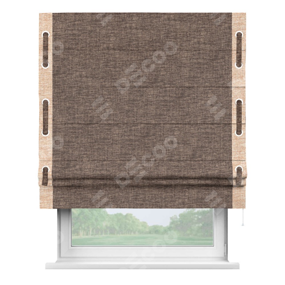 Римская штора «Кортин» для проёма, рогожка димаут коричневый, с кантом Стрим Дуо (люверсы с пояском)