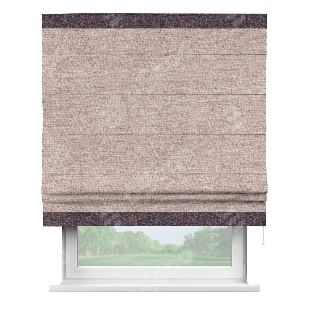 Римская штора пошита из ткани рогожка димаут пыльный розовый, артикул: 91019, с отделкой кантом «Горизонт» предлагает уникальное дизайнерское решение, при котором кант располагается только вверху и снизу шторы. Такое решение делает акцент на горизонтальных линиях, визуально расширяя пространство и придавая окну более строгий и организованный вид. Отделка кантом в этих ключевых местах не только украшает штору, но и способствует её долговечности, защищая наиболее уязвимые к износу края.