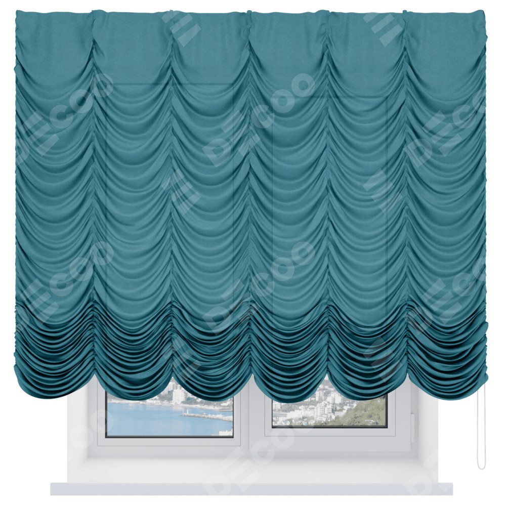 Французская штора производителя «Cortin», используется для проёма, пошита из ткани лён бирюзовый, артикул ткани 53436. Имеет универсальный механизм и подходит для монтажа: на потолок и на стену.