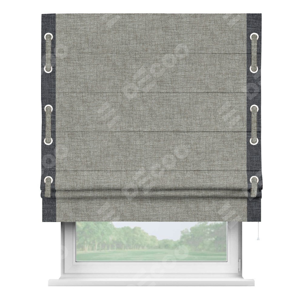Римская штора «Кортин» для проёма, рогожка димаут серый дуб, с кантом Стрим Дуо (люверсы с пояском)