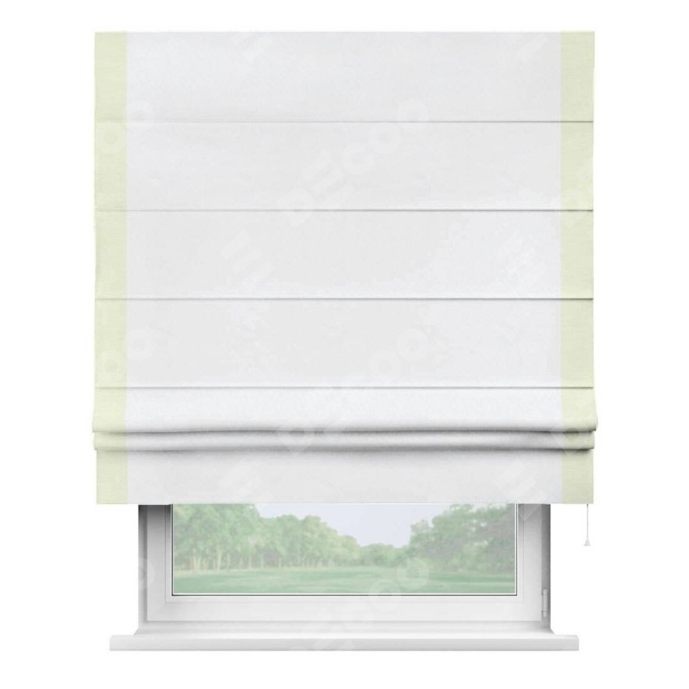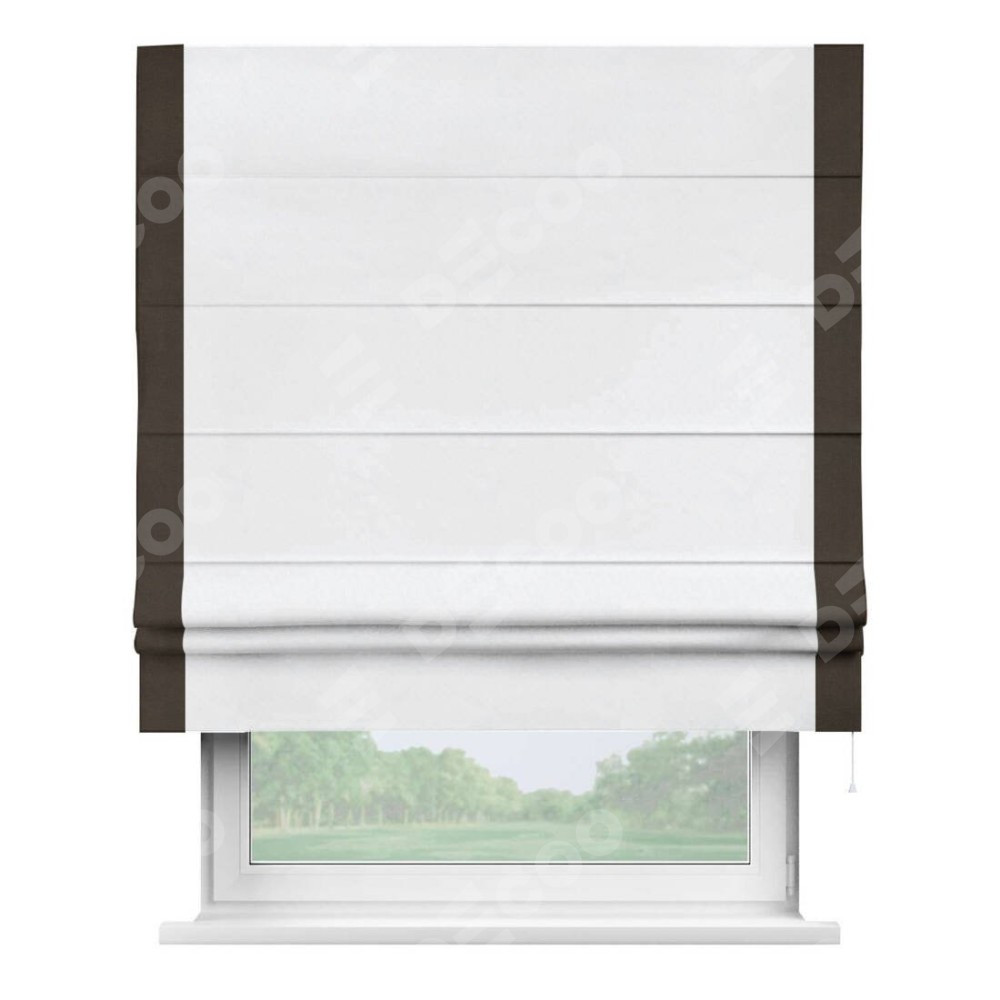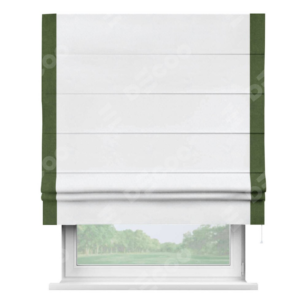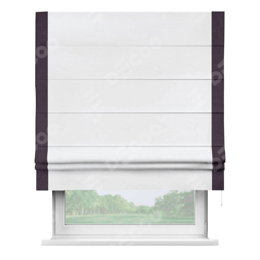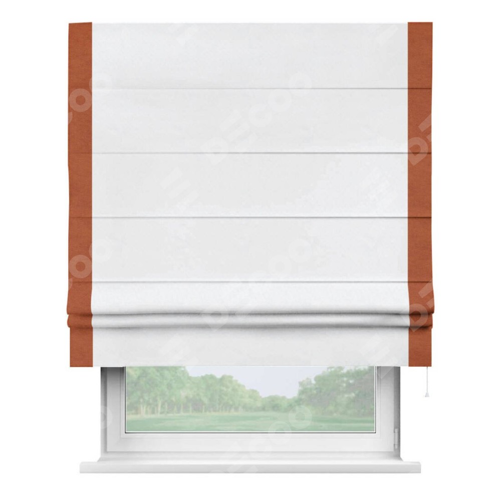 Римская штора пошита из ткани вельвет белоснежный, артикул: 92698, с отделкой кантом «Стрим Дуо» выделяется наличием кантов по обоим бокам шторы, слева и справа. Этот дизайн придает шторе аккуратный и завершенный вид, акцентируя вертикальные линии и визуально вытягивая окно в высоту. Отделка кантом по бокам не только украшает штору, но и служит практической функцией, укрепляя края и продлевая срок службы изделия.