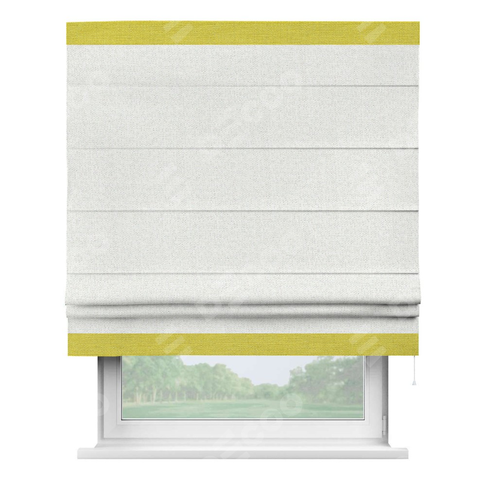 Римская штора пошита из ткани лён шампань, артикул: 91399, с отделкой кантом «Горизонт» предлагает уникальное дизайнерское решение, при котором кант располагается только вверху и снизу шторы. Такое решение делает акцент на горизонтальных линиях, визуально расширяя пространство и придавая окну более строгий и организованный вид. Отделка кантом в этих ключевых местах не только украшает штору, но и способствует её долговечности, защищая наиболее уязвимые к износу края.