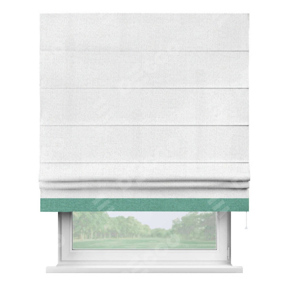 Римская штора пошита из ткани лён белоснежный, артикул: 95632, с отделкой кантом «Джестер» выделяется своей уникальной особенностью — кантом, расположенным только снизу шторы. Этот дизайн добавляет оригинальности и игривости оконному оформлению, делая акцент на нижней части шторы и создавая интересный визуальный эффект. Отделка кантом на нижнем крае не только служит эстетической функции, но и способствует увеличению прочности и износостойкости ткани в этом месте.