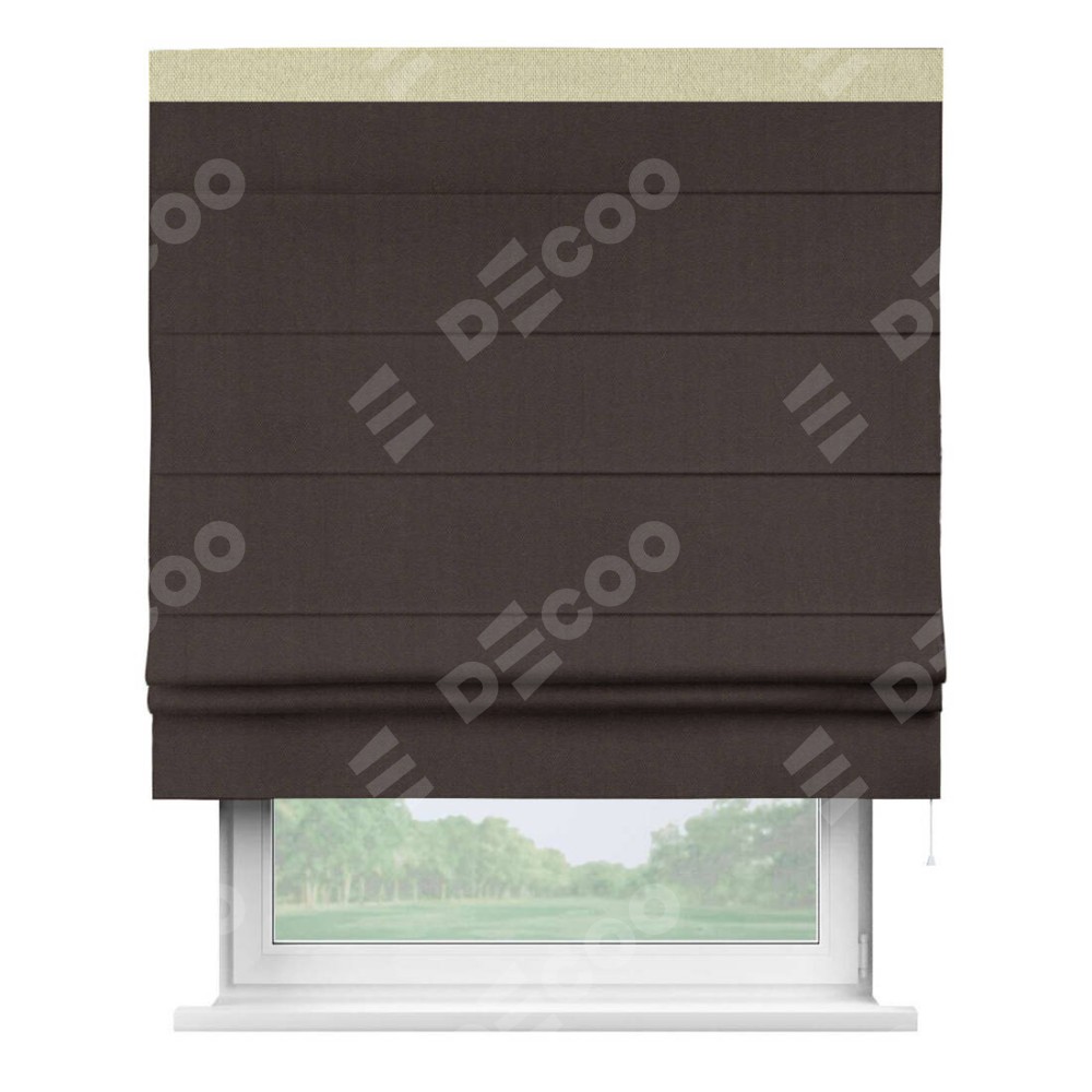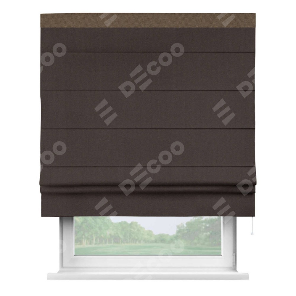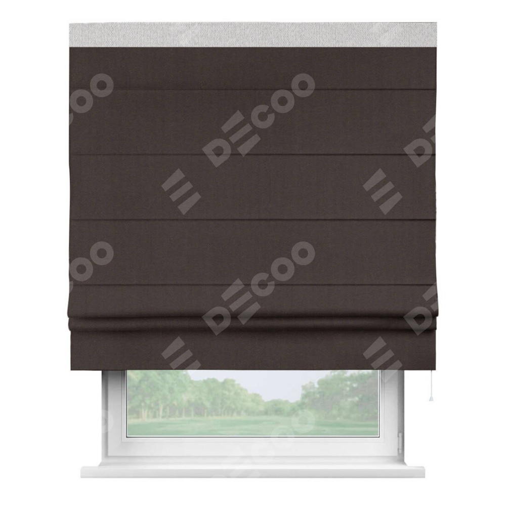 Римская штора пошита из ткани лён димаут венге, артикул: 91001, с отделкой кантом «Кинг» отличается своей необычной особенностью: кант располагается исключительно сверху шторы. Такой дизайн делает акцент на верхней части окна, визуально поднимая потолок и придавая интерьеру более возвышенный и изысканный вид. Отделка кантом на верхней кромке не только украшает штору, но и может служить дополнительной защитой от износа в месте наибольшего контакта с механизмом управления шторой.