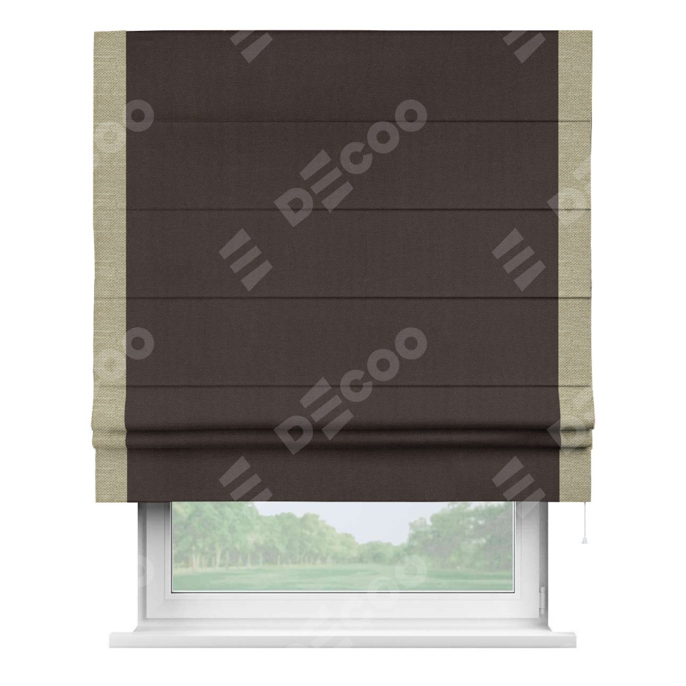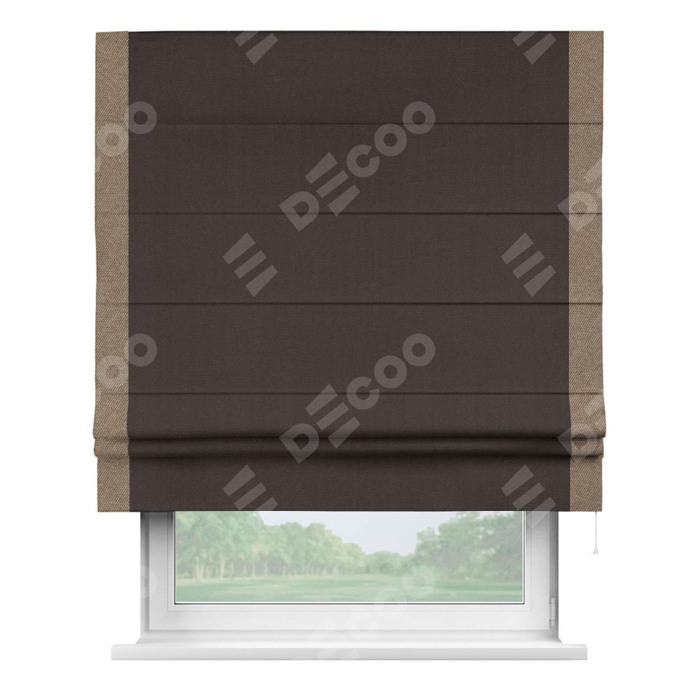 Римская штора пошита из ткани лён димаут венге, артикул: 91001, с отделкой кантом «Стрим Дуо» выделяется наличием кантов по обоим бокам шторы, слева и справа. Этот дизайн придает шторе аккуратный и завершенный вид, акцентируя вертикальные линии и визуально вытягивая окно в высоту. Отделка кантом по бокам не только украшает штору, но и служит практической функцией, укрепляя края и продлевая срок службы изделия.