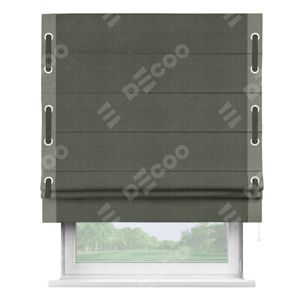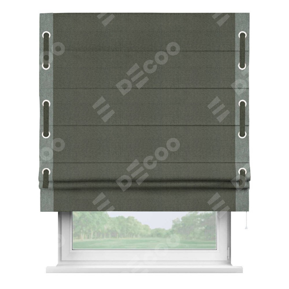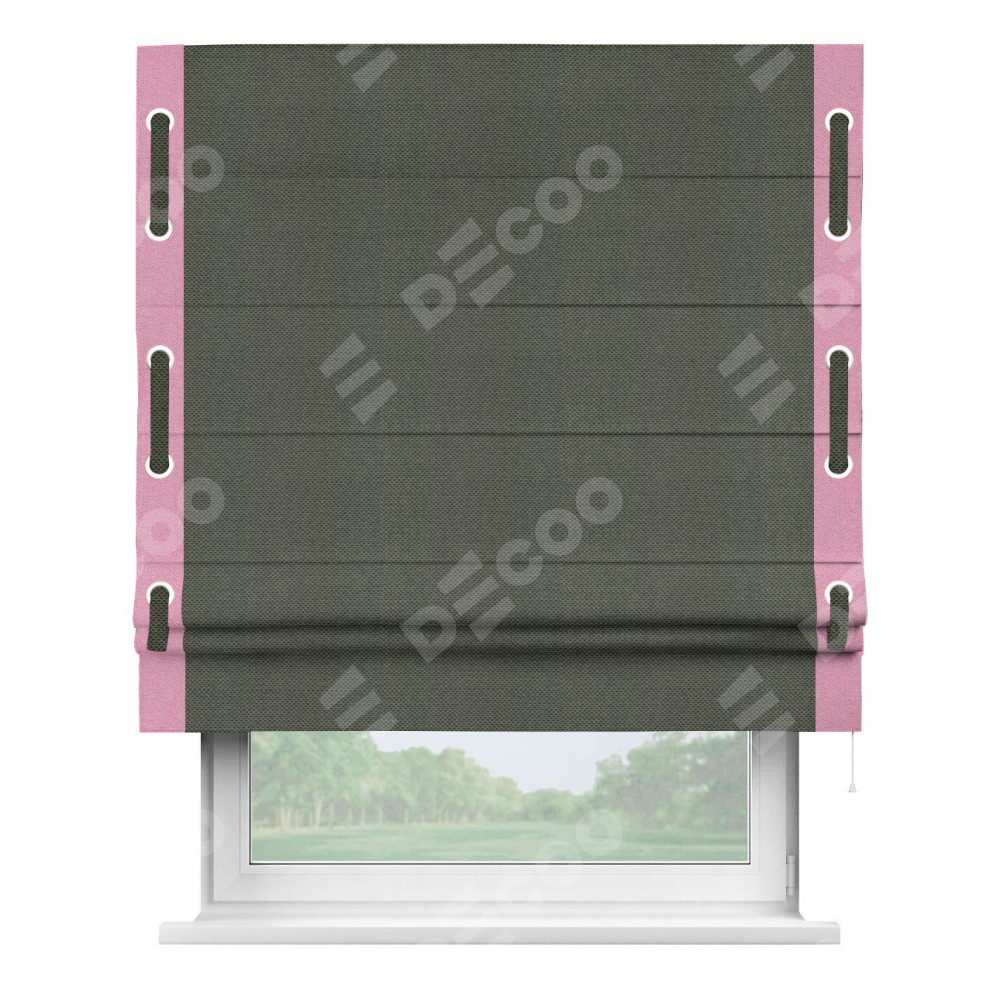 Римская штора производителя «Cortin», используется для проёма, пошита из ткани лён димаут графит, артикул 27. Отделка шторы кантом «Стрим Дуо» на кантах расположены люверсы с пояском, ткань для канта используется лён димаут разной расцветки на выбор. Ткань для пояска обычно используется из основной ткани шторы, а так же можно сделать из любой расцветки по желанию. Имеет универсальный механизм и подходит для монтажа: на потолок, на стену и в нишу.