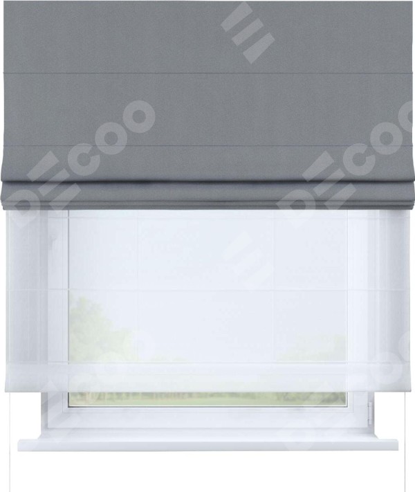 Двойная римская штора «День-ночь» от производителя Cortin предназначена для использования в проёмах. Эта штора уникальна тем, что состоит из двух полотен. На лицевой стороне находится однотонный блэкаут серый (артикул: 146436), обеспечивающий эффективное затемнение. В комплект также входит вторая ткань — легкий белый тюль (артикул: V-01), который добавляет изящества и легкости оформлению окна. Кроме того, доступны и другие разновидности ткани тюль, выбор которых доступен по  ссылке .