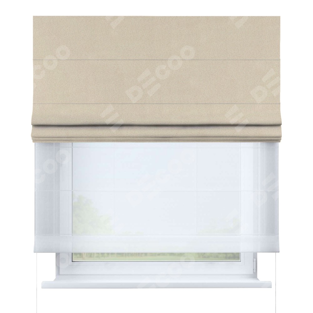 Двойная римская штора «День-ночь» от производителя Cortin предназначена для использования в проёмах. Эта штора уникальна тем, что состоит из двух полотен. На лицевой стороне находится однотонный блэкаут кофейно-бежевый (артикул: 91566−1), обеспечивающий эффективное затемнение. В комплект также входит вторая ткань — легкий белый тюль (артикул: V-01), который добавляет изящества и легкости оформлению окна. Кроме того, доступны и другие разновидности ткани тюль, выбор которых доступен по ссылке .