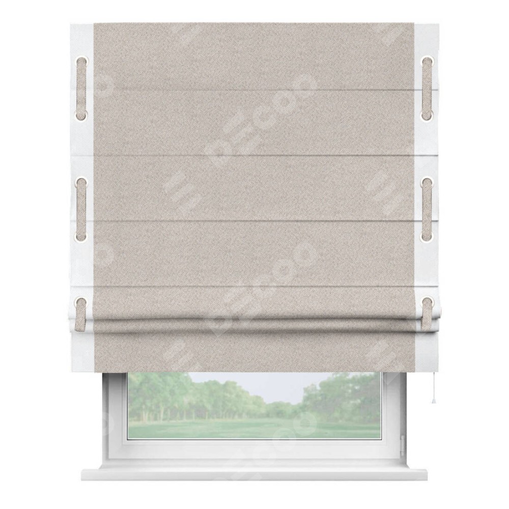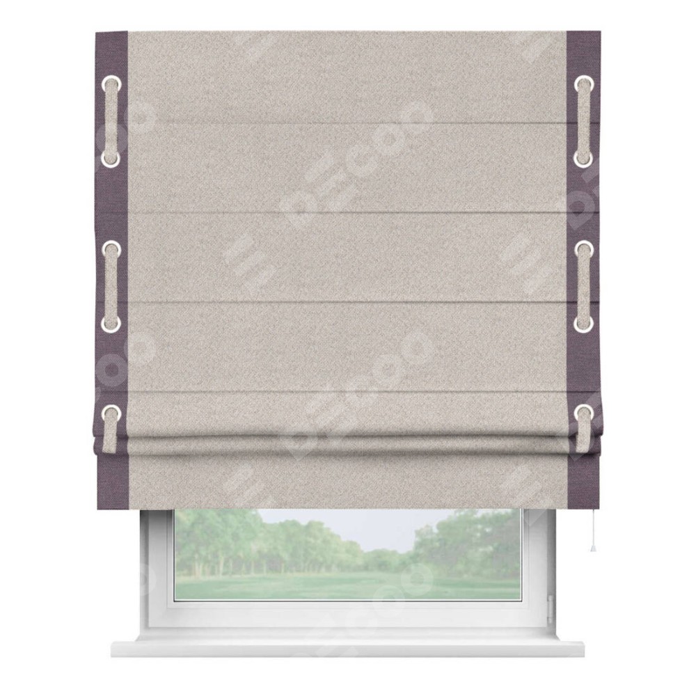 Римская штора «Кортин» для проема, лён димаут бежевый с кантом Стрим Дуо (люверсы с пояском)