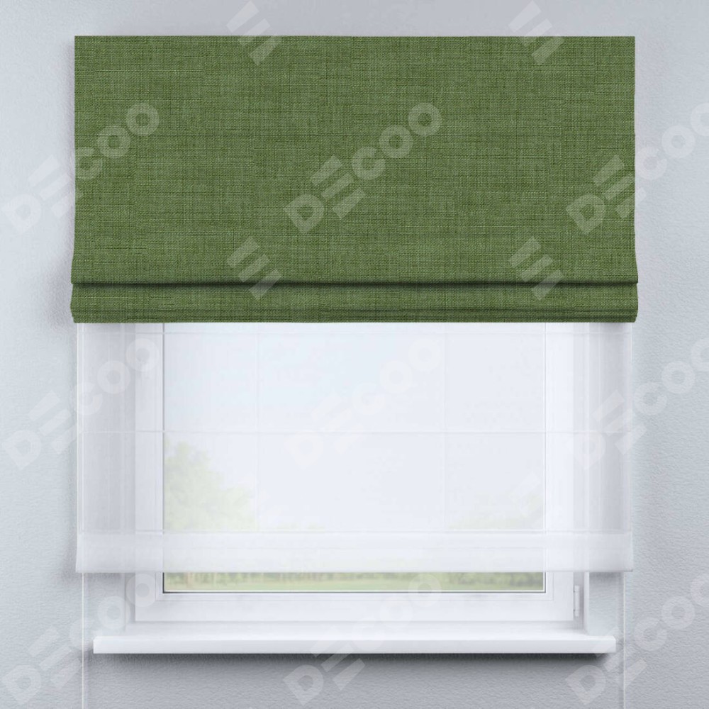Двойная римская штора «День-ночь» от производителя Cortin предназначена для использования в проёмах. Эта штора уникальна тем, что состоит из двух полотен. На лицевой стороне находится лён зелёный (артикул: 131547), обеспечивающий эффективное затемнение. В комплект также входит вторая ткань — легкий белый тюль (артикул: V-01), который добавляет изящества и легкости оформлению окна. Кроме того, доступны и другие разновидности ткани тюль, выбор которых доступен по  ссылке .