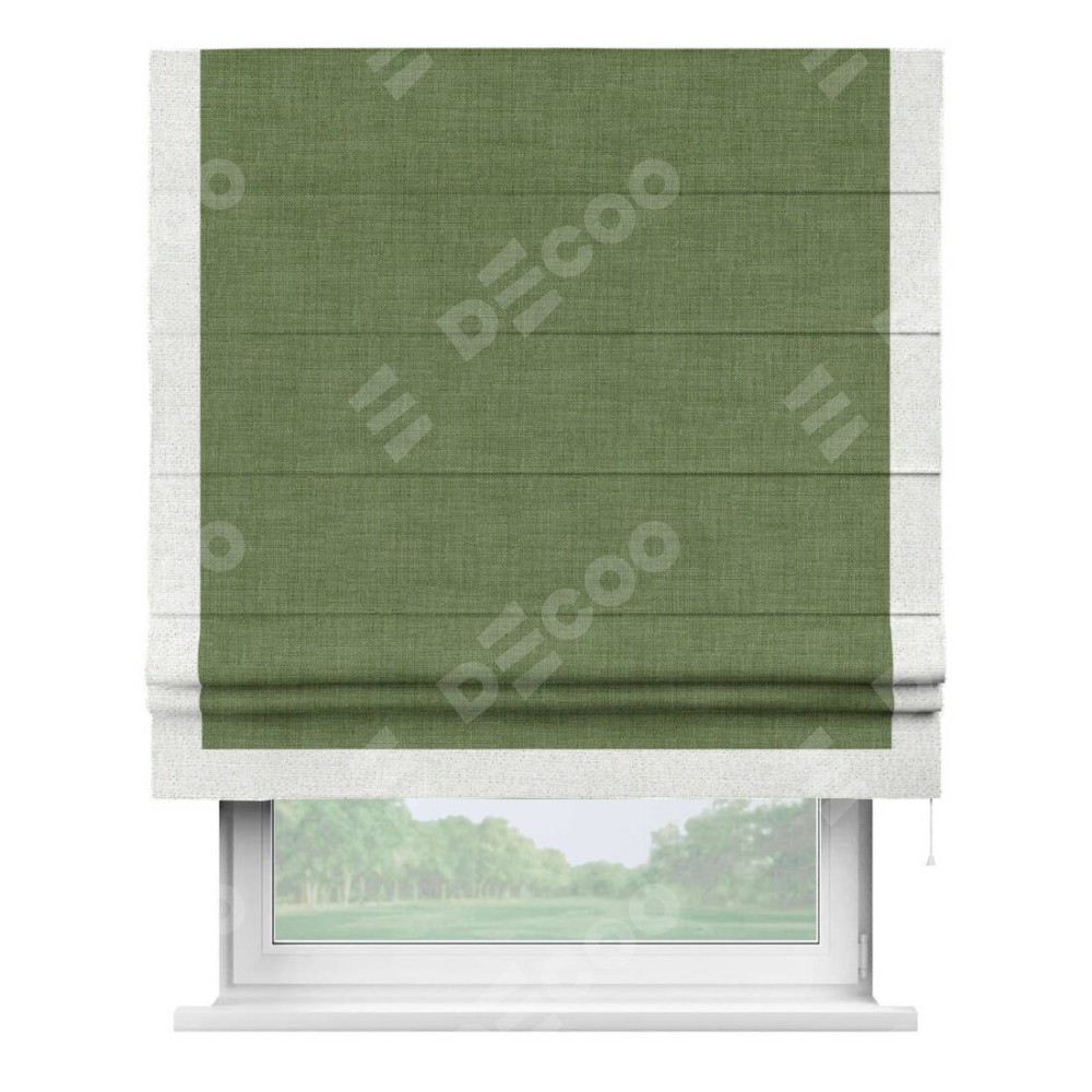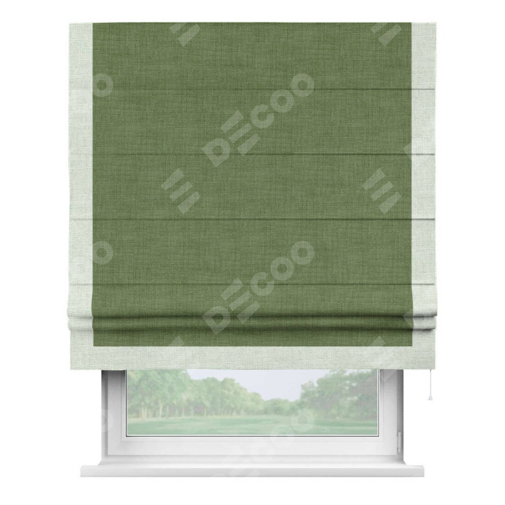 Классическая римская штора производителя «Cortin», пошита из ткани лён зелёный, артикул: 131547. Имеет универсальный механизм и подходит для монтажа: на потолок, на стену и в нишу.