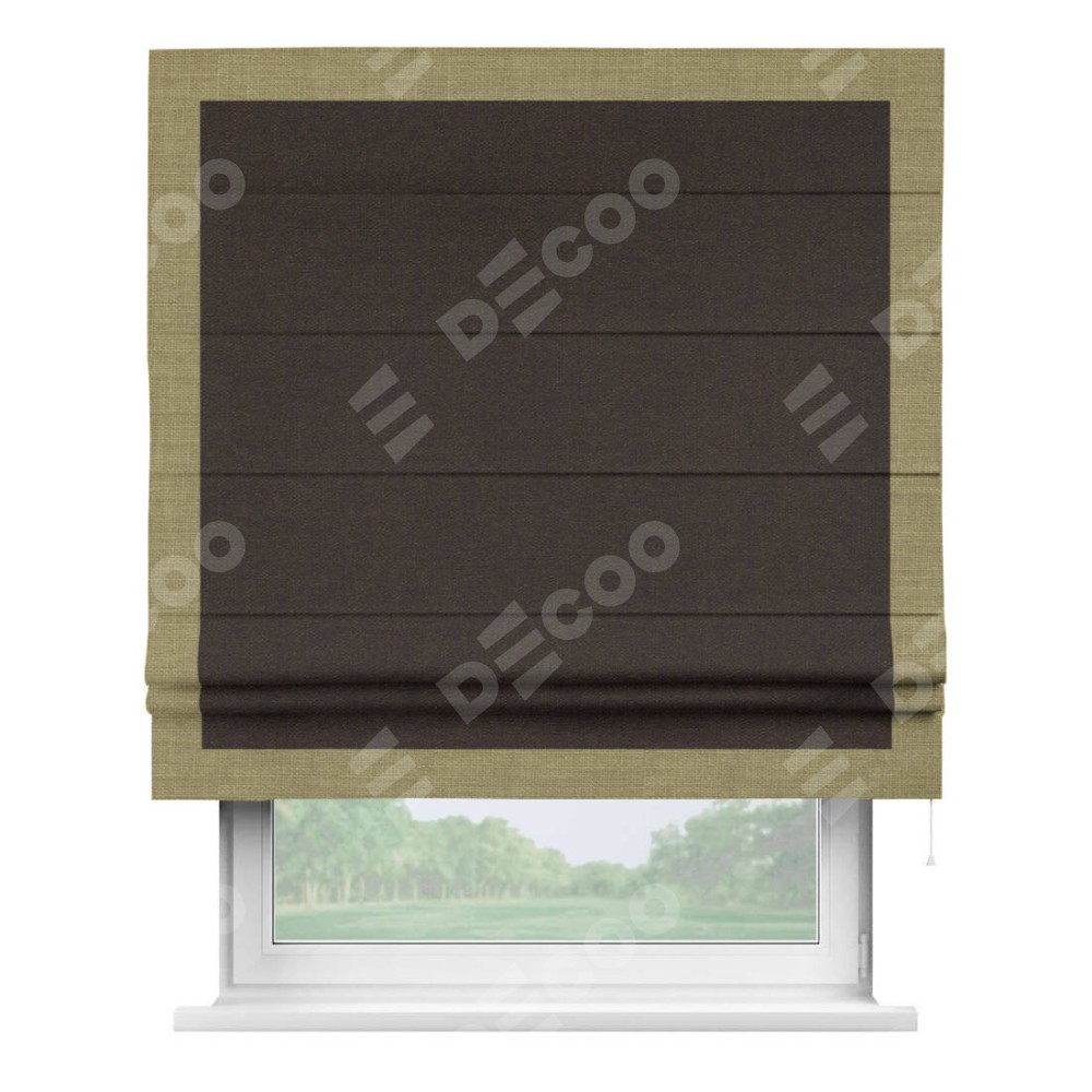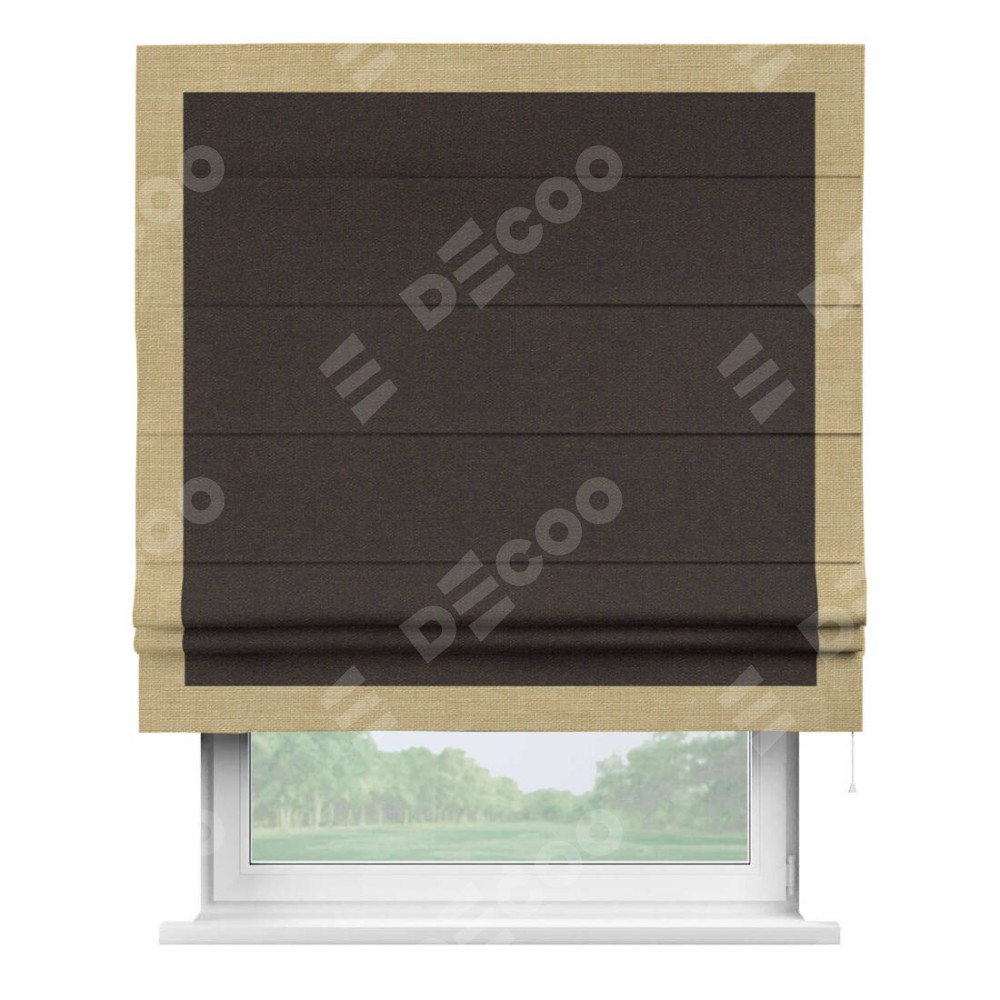 Классическая римская штора производителя «Cortin», пошита из ткани лён тёмно-коричневый, артикул: 104497. Имеет универсальный механизм и подходит для монтажа: на потолок, на стену и в нишу.