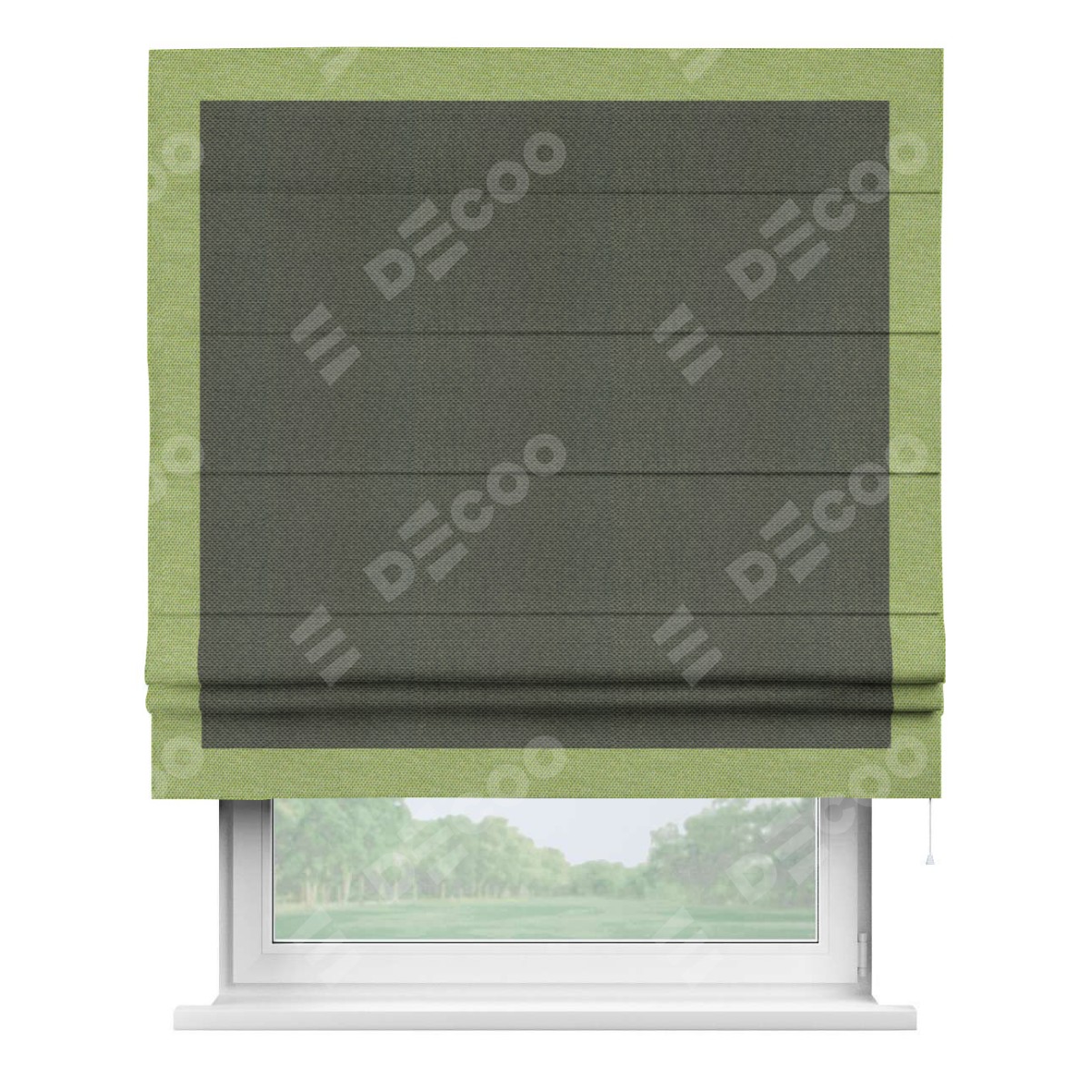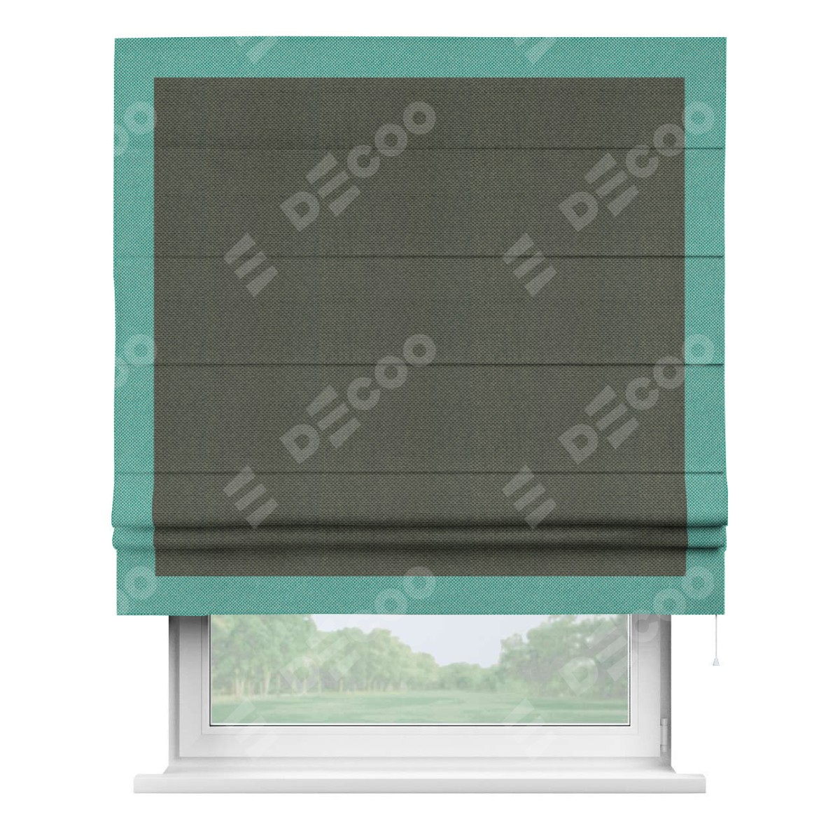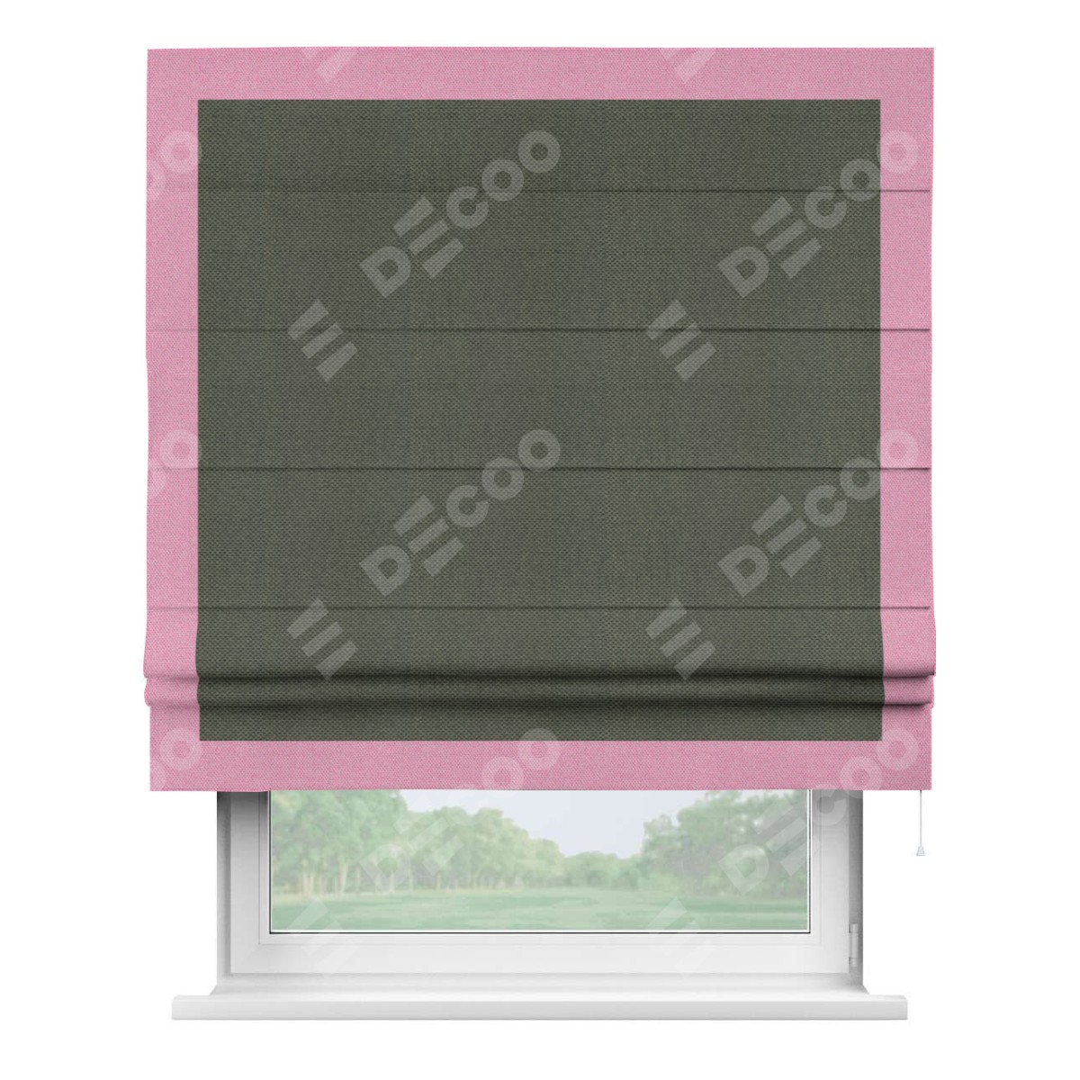 Римская штора производителя «Cortin», используется для проёма, пошита из ткани лён димаут графит, артикул 27. Отделка шторы кантом «Чесс», ткань для канта используется из льна димаут разной расцветки на выбор. Имеет универсальный механизм и подходит для монтажа: на потолок, на стену и в нишу.