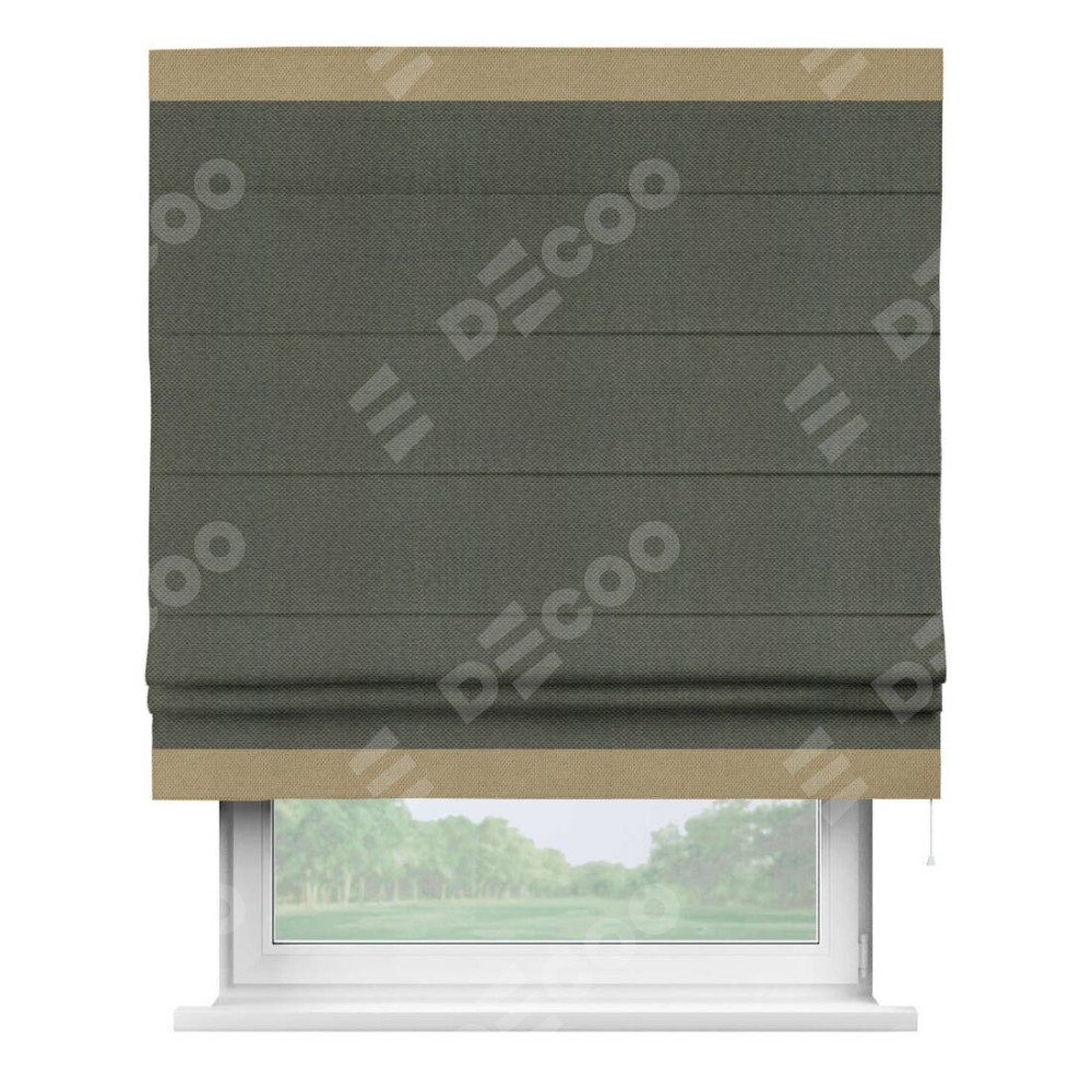 Римская штора производителя «Cortin», используется для проёма, пошита из ткани лён димаут графит, артикул 27. Отделка шторы кантом «Горизонт», ткань для канта используется из льна димаут разной расцветки на выбор. Имеет универсальный механизм и подходит для монтажа: на потолок, на стену и в нишу.