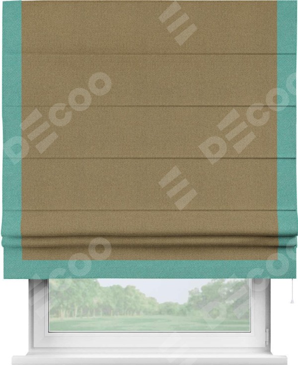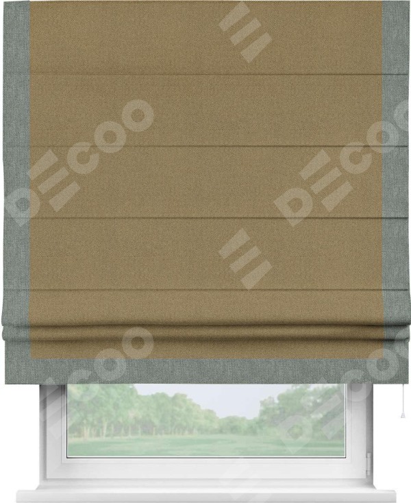 Римская штора производителя «Cortin», используется для проёма, пошита из ткани лён димаут оливковый, артикул 16243. Отделка шторы кантом «Виктория», ткань для канта используется из льна димаут разной расцветки на выбор. Имеет универсальный механизм и подходит для монтажа: на потолок, на стену и в нишу.