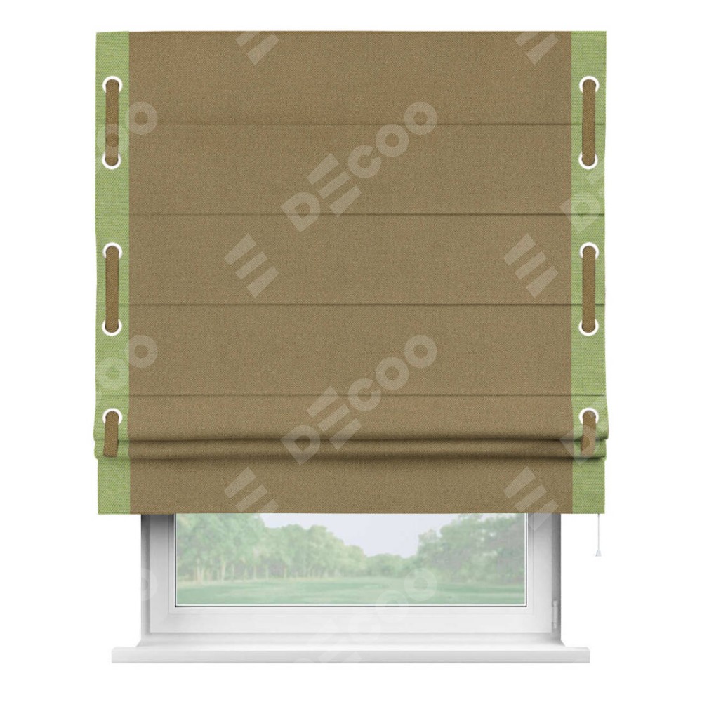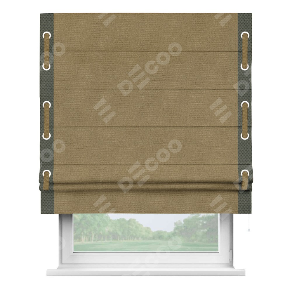 Римская штора производителя «Cortin», используется для проёма, пошита из ткани лён димаут оливковый, артикул 16243. Отделка шторы кантом «Стрим Дуо» на кантах расположены люверсы с пояском, ткань для канта используется лён димаут разной расцветки на выбор. Ткань для пояска обычно используется из основной ткани шторы, а так же можно сделать из любой расцветки по желанию. Имеет универсальный механизм и подходит для монтажа: на потолок, на стену и в нишу.