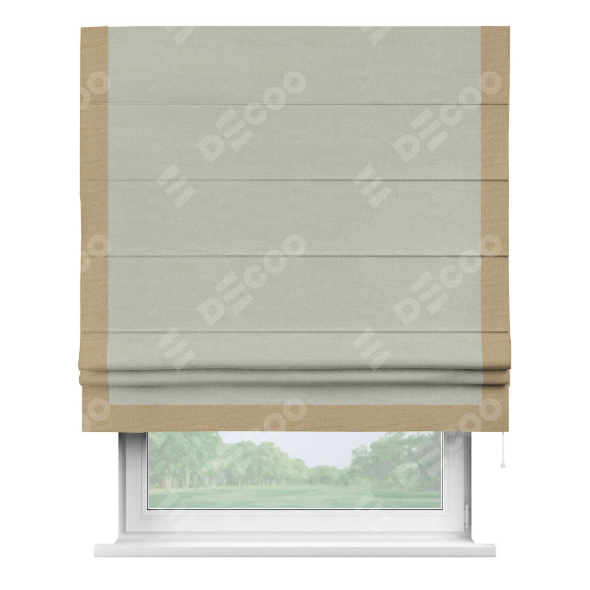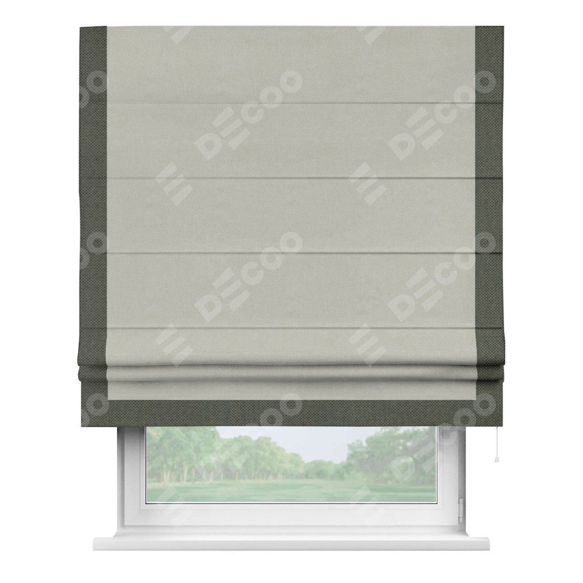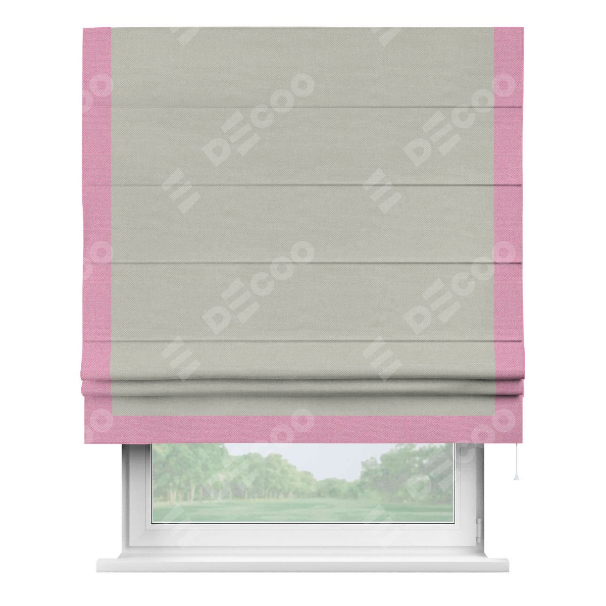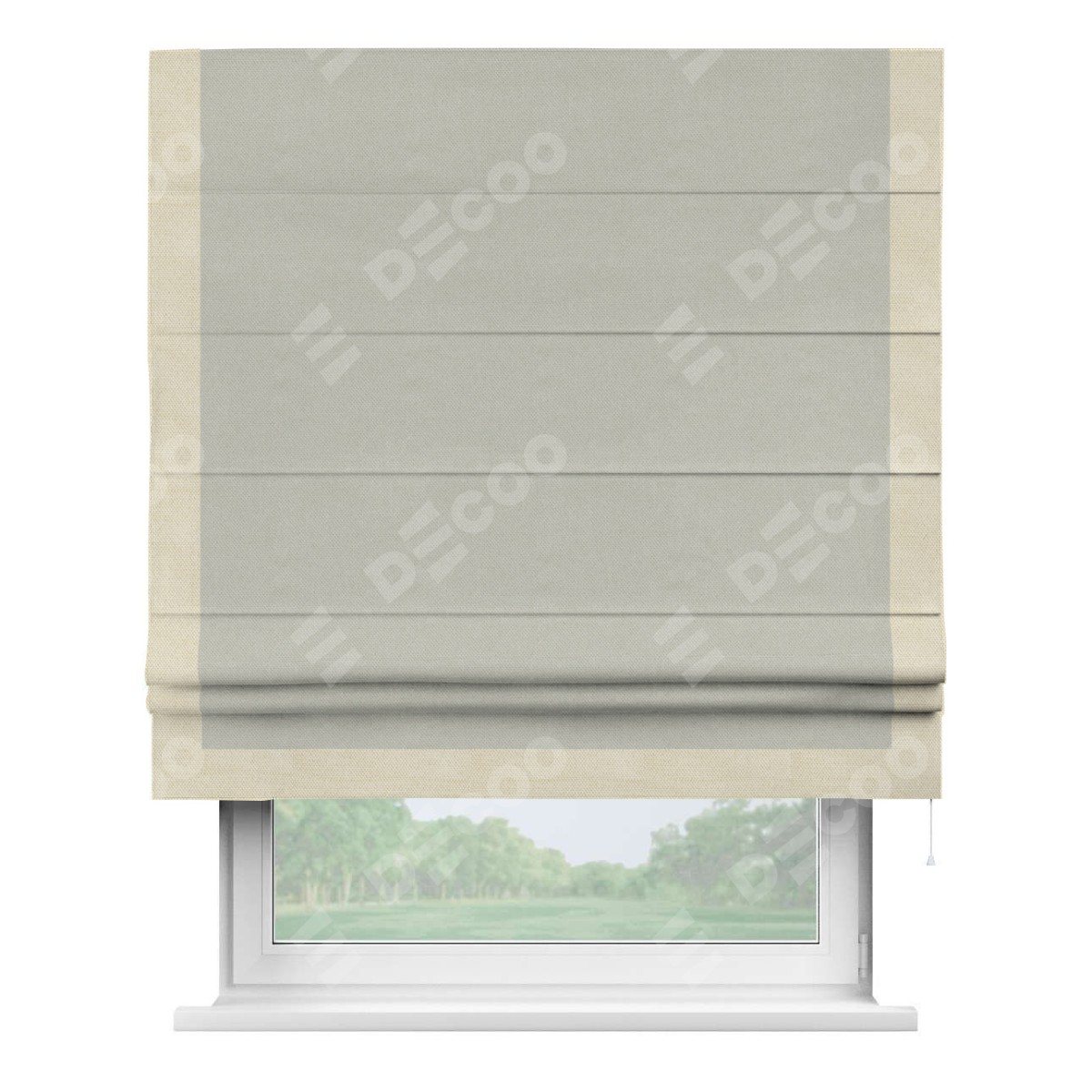 Римская штора производителя «Cortin», используется для проёма, пошита из ткани лён димаут светло-серый, артикул 83025. Отделка шторы кантом «Виктория», ткань для канта используется из льна димаут разной расцветки на выбор. Имеет универсальный механизм и подходит для монтажа: на потолок, на стену и в нишу.