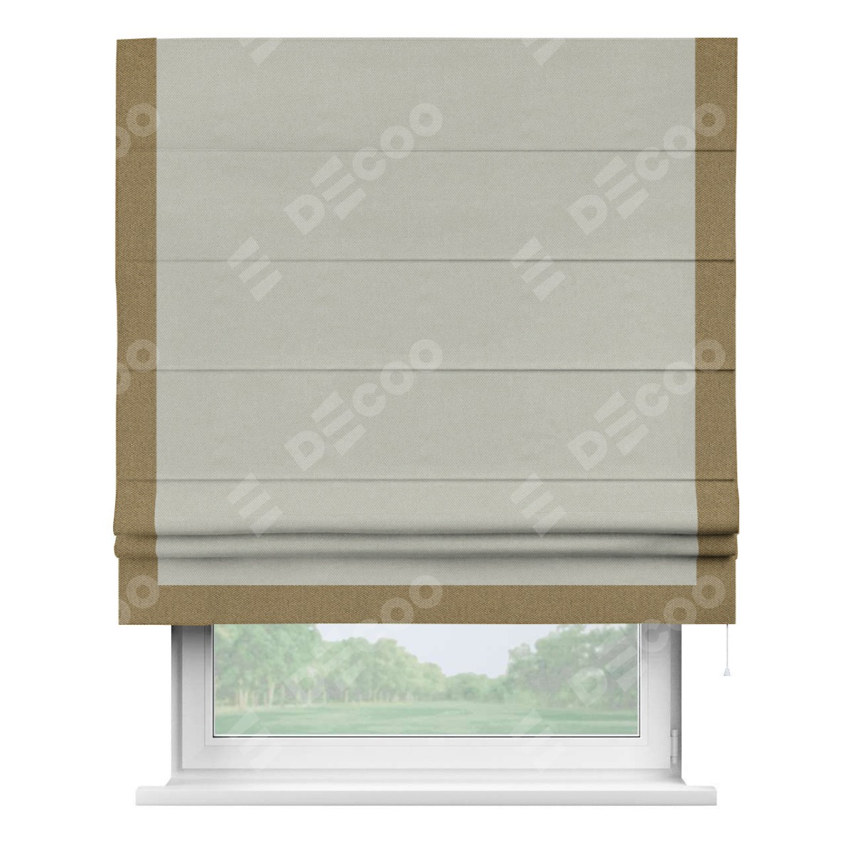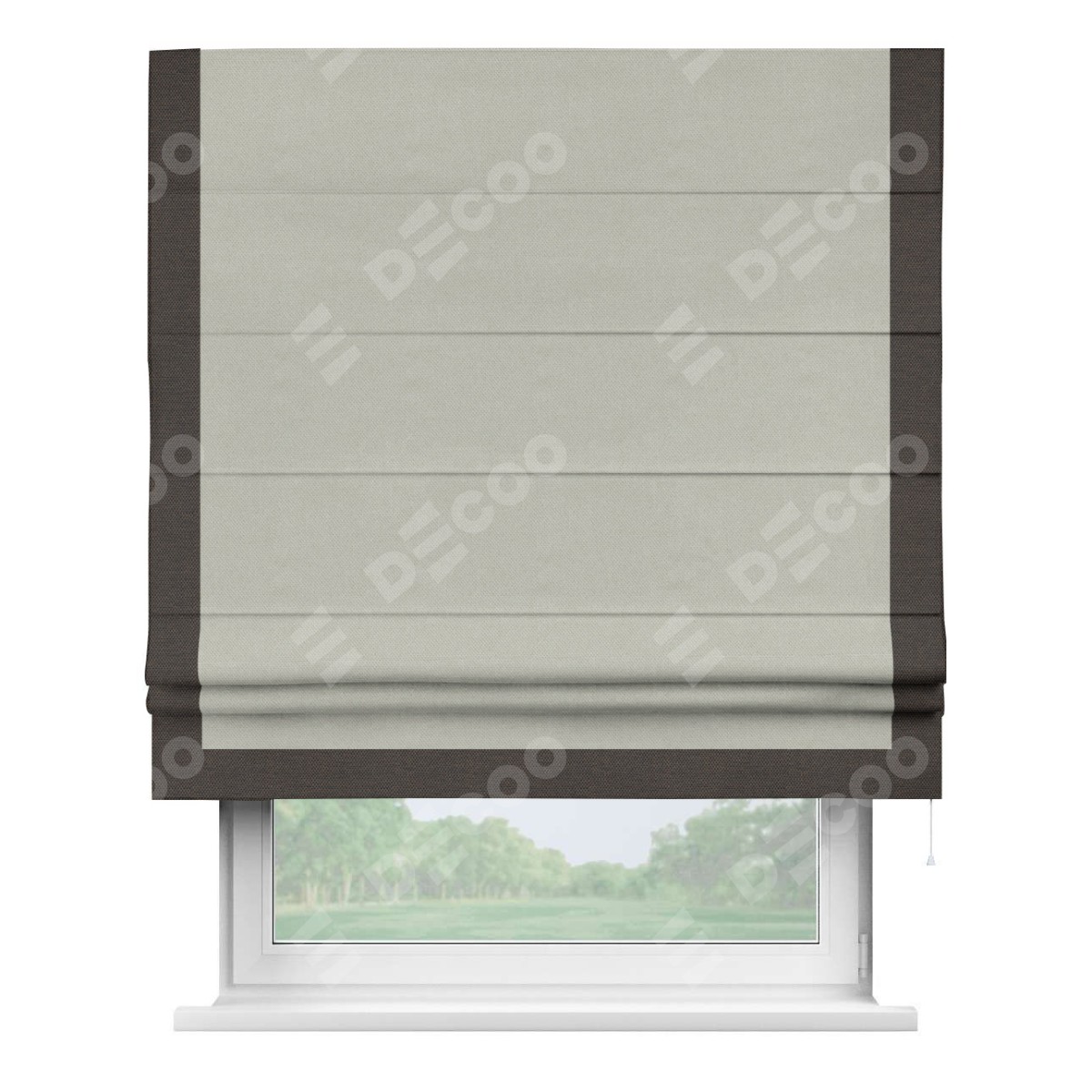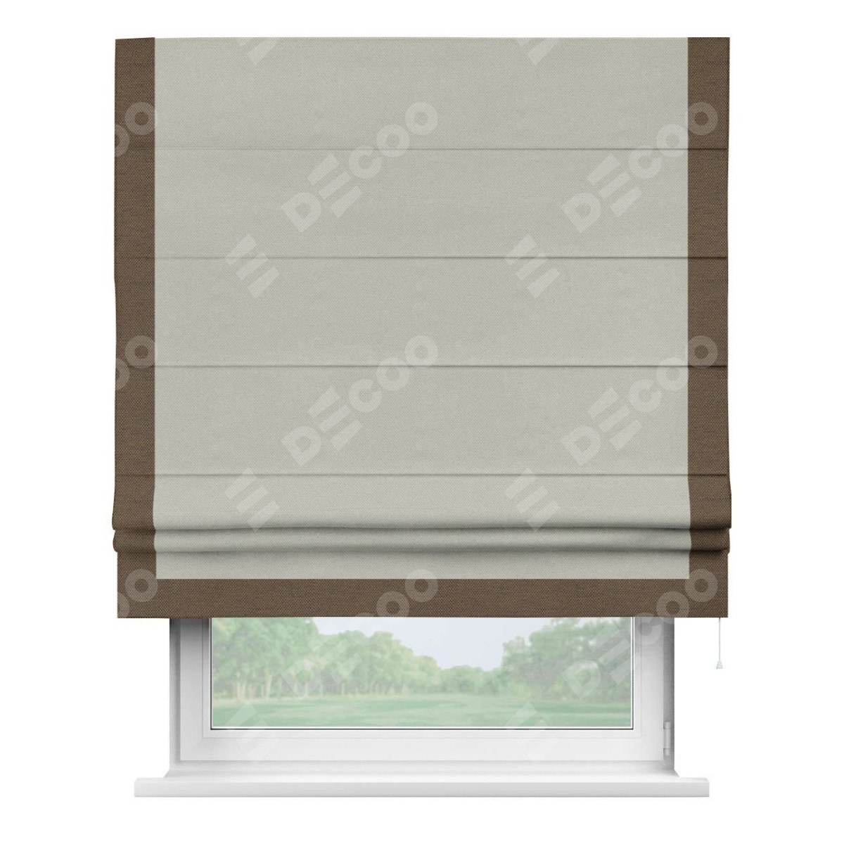 Римская штора производителя «Cortin», используется для проёма, пошита из ткани лён димаут светло-серый, артикул 83025. Отделка шторы кантом «Виктория», ткань для канта используется из льна димаут разной расцветки на выбор. Имеет универсальный механизм и подходит для монтажа: на потолок, на стену и в нишу.