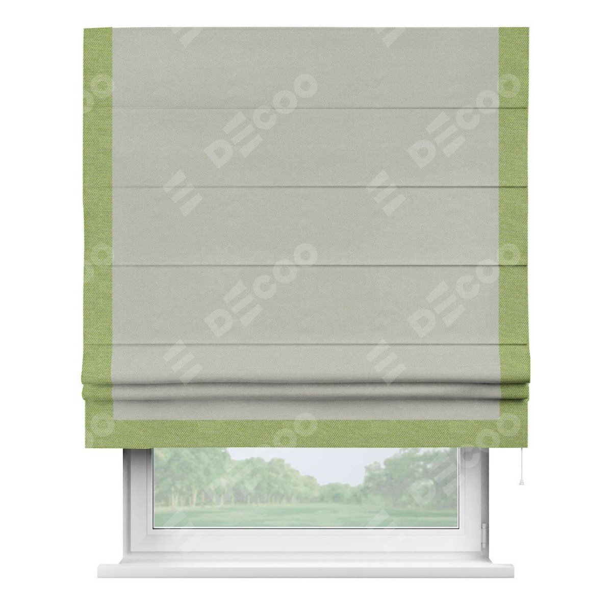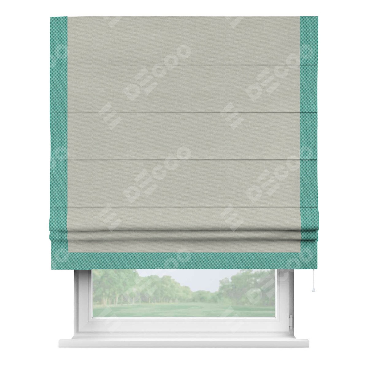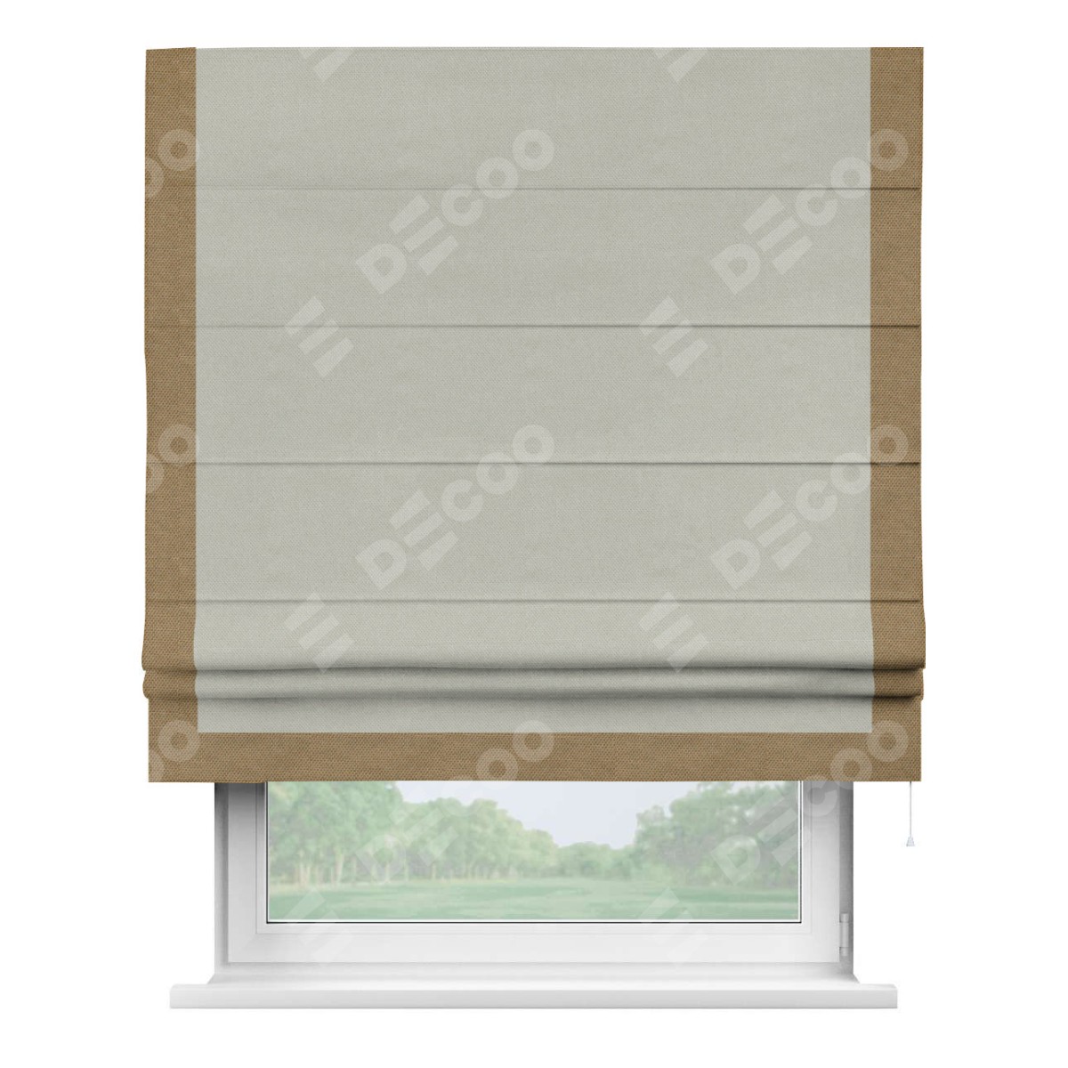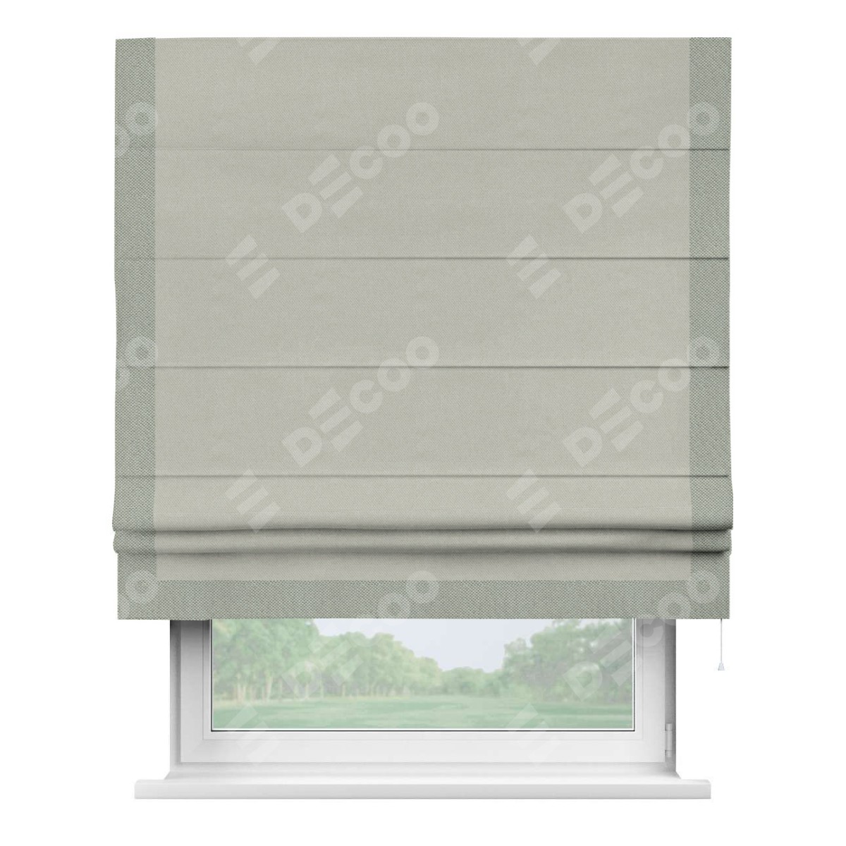 Римская штора производителя «Cortin», используется для проёма, пошита из ткани лён димаут светло-серый, артикул 83025. Отделка шторы кантом «Виктория», ткань для канта используется из льна димаут разной расцветки на выбор. Имеет универсальный механизм и подходит для монтажа: на потолок, на стену и в нишу.