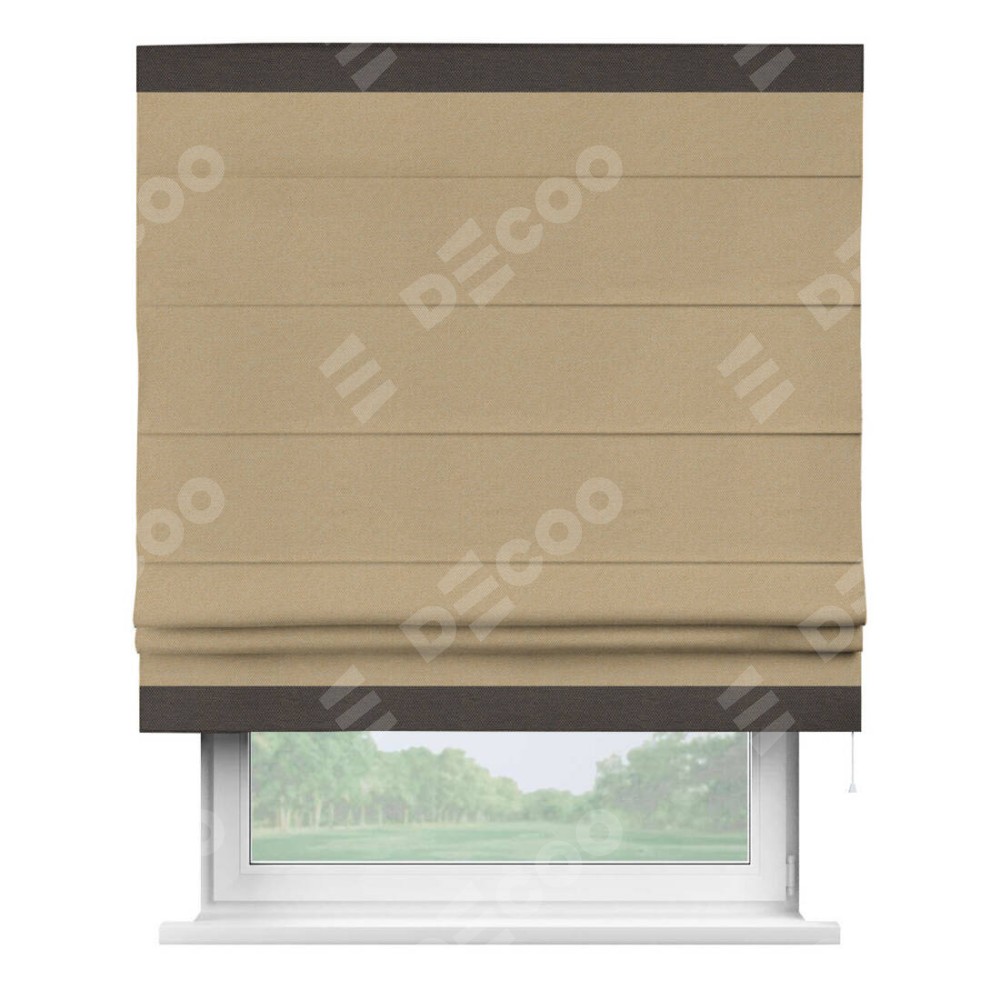 Римская штора производителя «Cortin», используется для проёма, пошита из ткани лён димаут тёмно-бежевый, артикул 83037. Отделка шторы кантом «Горизонт», ткань для канта используется из льна димаут разной расцветки на выбор. Имеет универсальный механизм и подходит для монтажа: на потолок, на стену и в нишу.