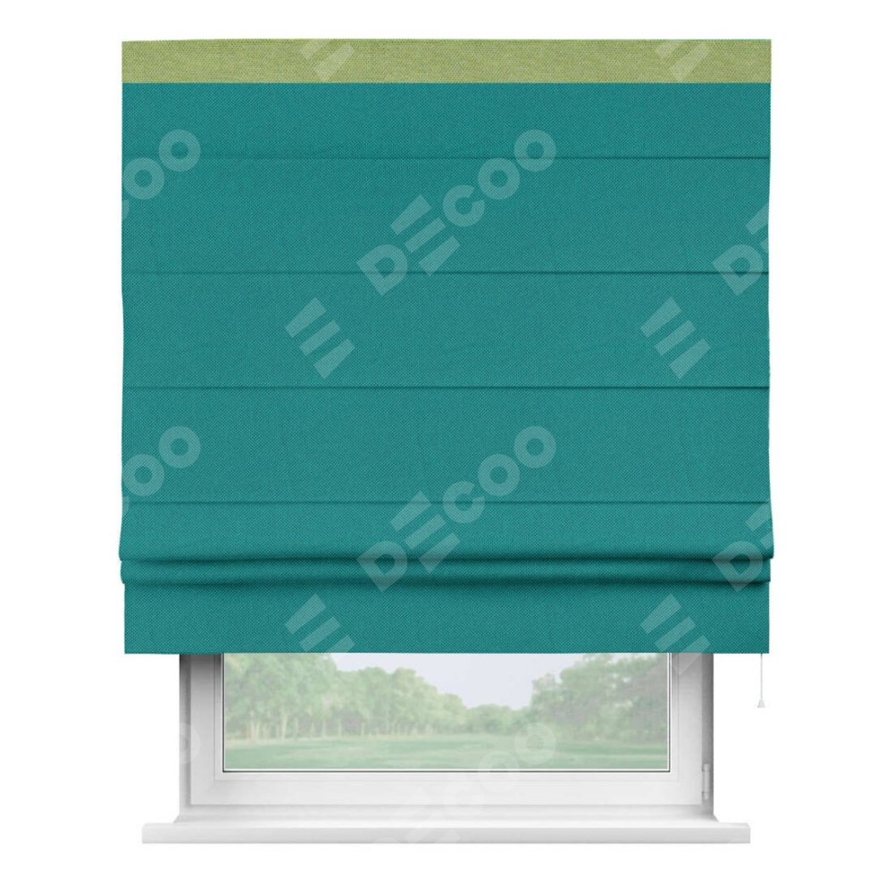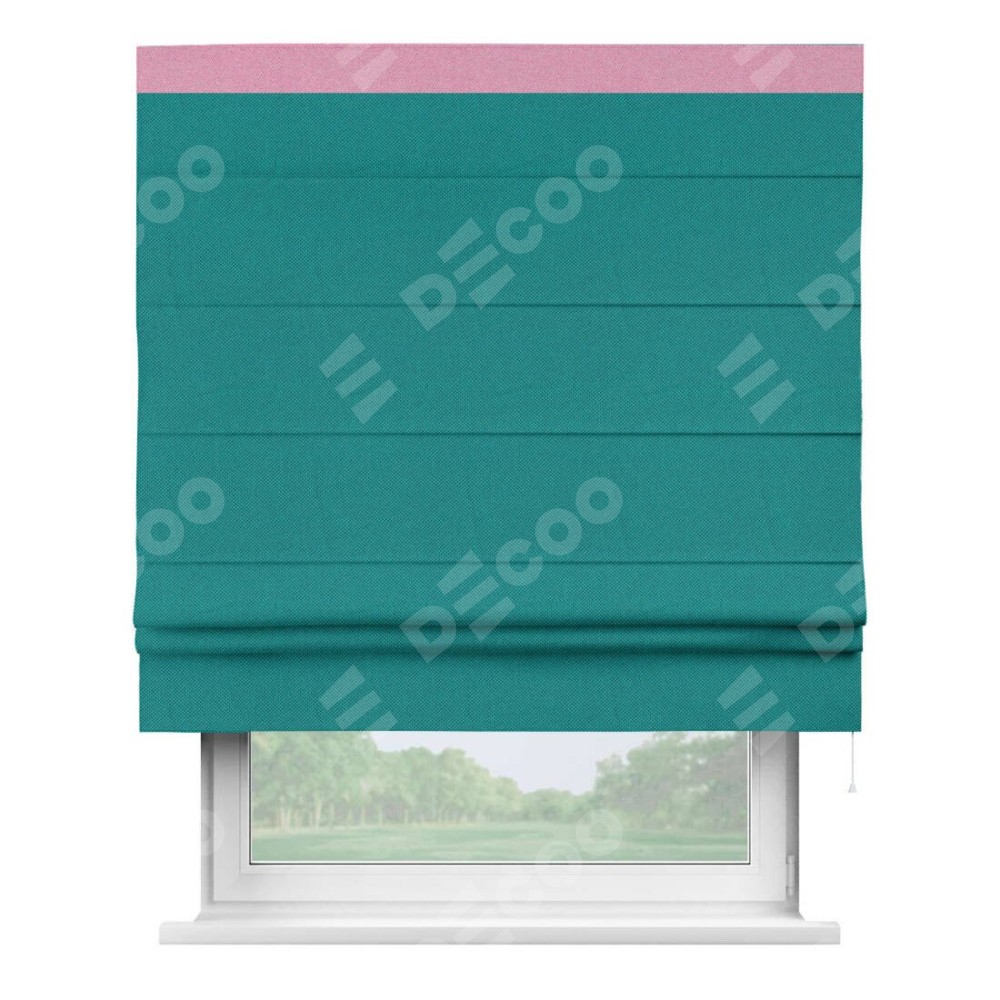 Римская штора производителя «Cortin», используется для проёма, пошита из ткани лён димаут тёмно-бирюзовый, артикул 318. Отделка шторы кантом «Кинг», ткань для канта используется из льна димаут разной расцветки на выбор. Имеет универсальный механизм и подходит для монтажа: на потолок, на стену и в нишу.