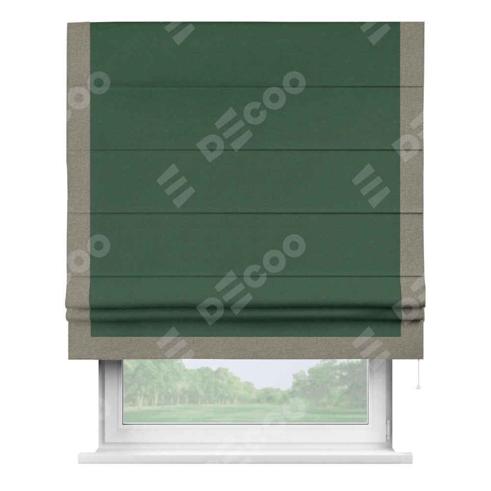 Римская штора производителя «Cortin», используется для проёма, пошита из ткани лён димаут тёмно-зелёный, артикул 16246. Отделка шторы кантом «Виктория», ткань для канта используется из льна димаут разной расцветки на выбор. Имеет универсальный механизм и подходит для монтажа: на потолок, на стену и в нишу.