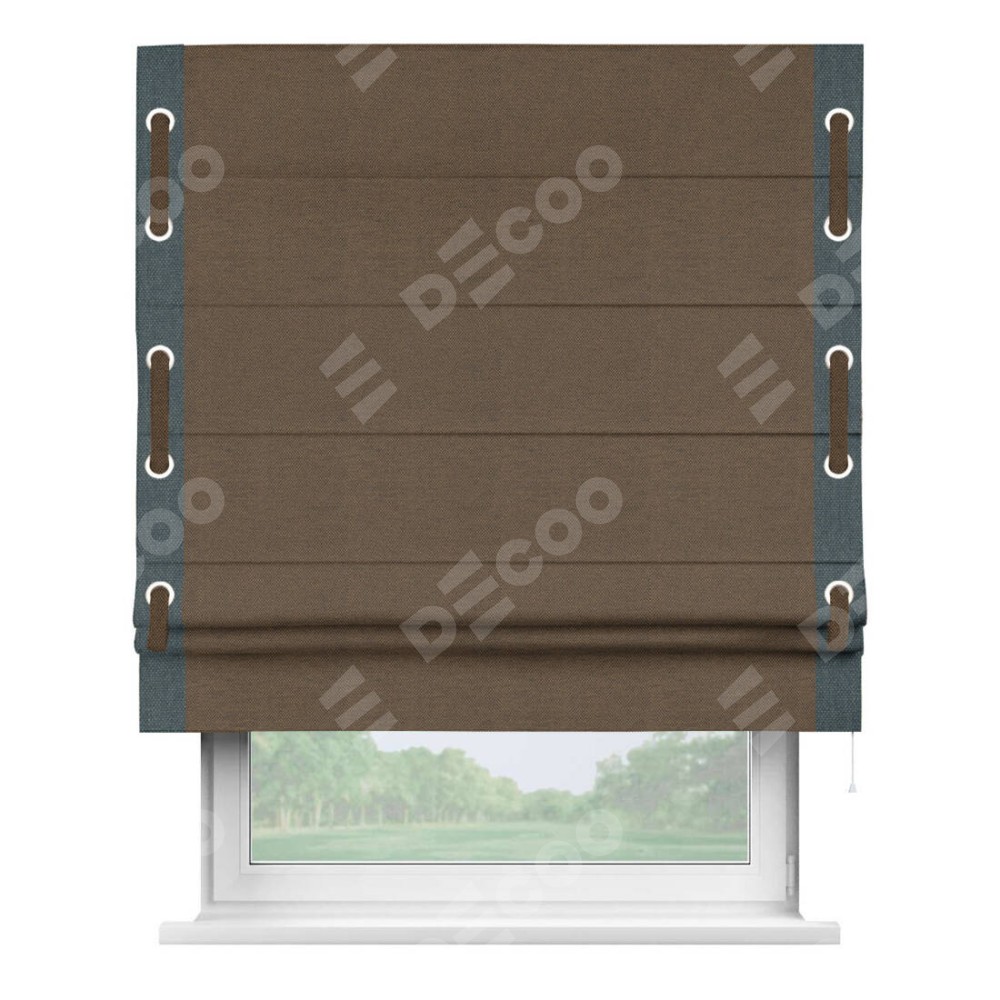 Римская штора производителя «Cortin», используется для проёма, пошита из ткани лён димаут тёмно-коричневый, артикул 83030. Отделка шторы кантом «Стрим Дуо» на кантах расположены люверсы с пояском, ткань для канта используется лён димаут разной расцветки на выбор. Ткань для пояска обычно используется из основной ткани шторы, а так же можно сделать из любой расцветки по желанию. Имеет универсальный механизм и подходит для монтажа: на потолок, на стену и в нишу.
